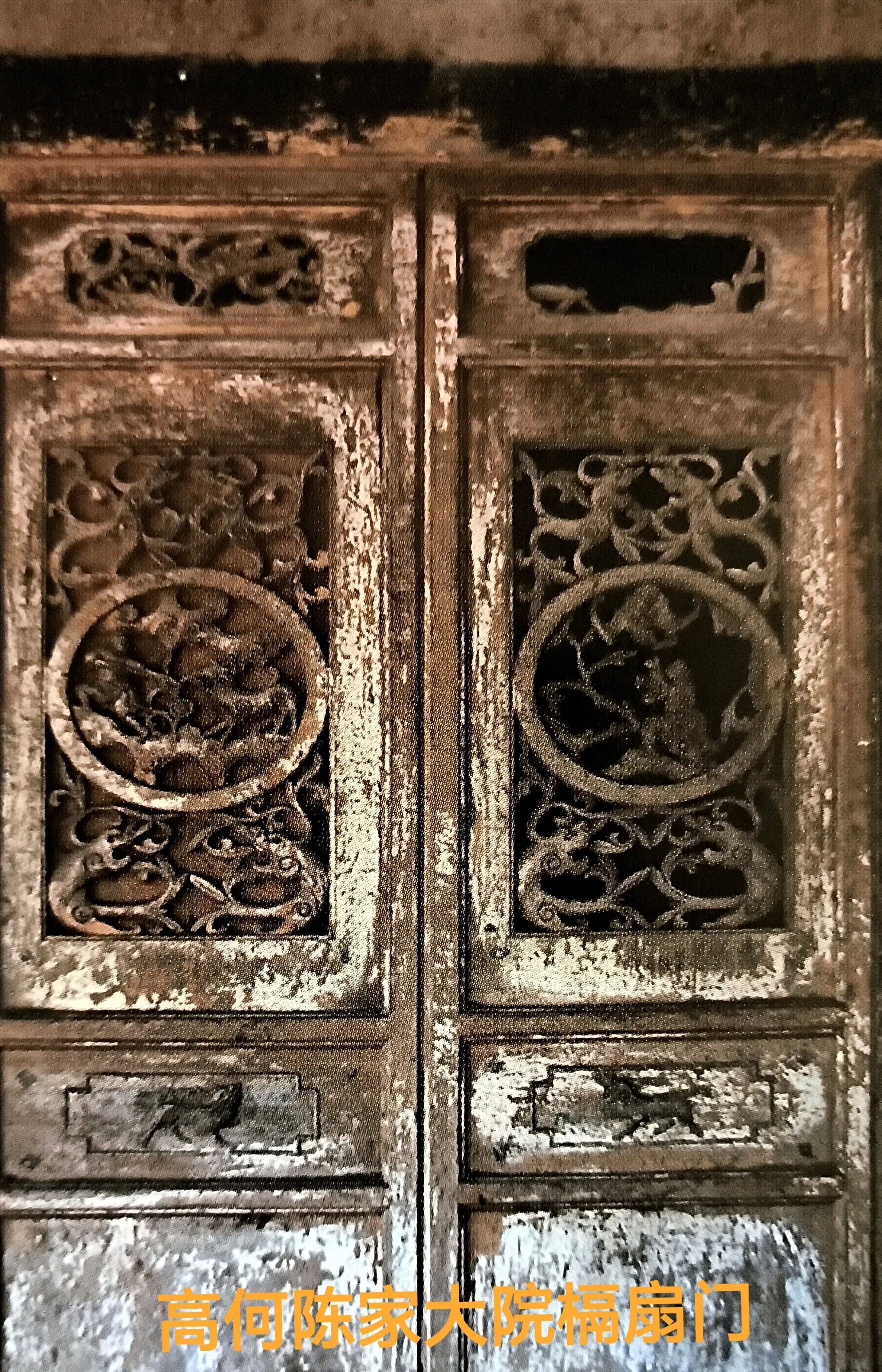 前厅正大门六扇,板门两扇,左右槅扇门各两扇。槅扇门上部偻空雕鱼龙、麒麟纹。圆形窗心,镂空浮雕福、禄、寿、喜人物。中腰花板上浮雕四瑞兽。门楣枋之上做大方格花瓣纹四抹格花窗。门厅二门为六扇槅扇门,门后为天井。正厅、左右厢房和前厅瓦屋檐相连,檐廊相通。檐柱挑枋上双挑坐墩,用方形雕花宝瓶式短柱立于挑枋上。上层挑枋头刻龙首,后部作弓形龙尾。墙面上部为篱夹壁或大方格窗,中下部做木装板、雕花门窗、木裙板。花窗式样、纹样丰富,全部在长方形灯笼框子中间采用镂空浮雕,多以夔龙纹、鱼龙纹、凤鸟纹、狮虎纹、麒麟纹等瑞兽纹和琴、棋、书、画等人物故事为题材是其特点。