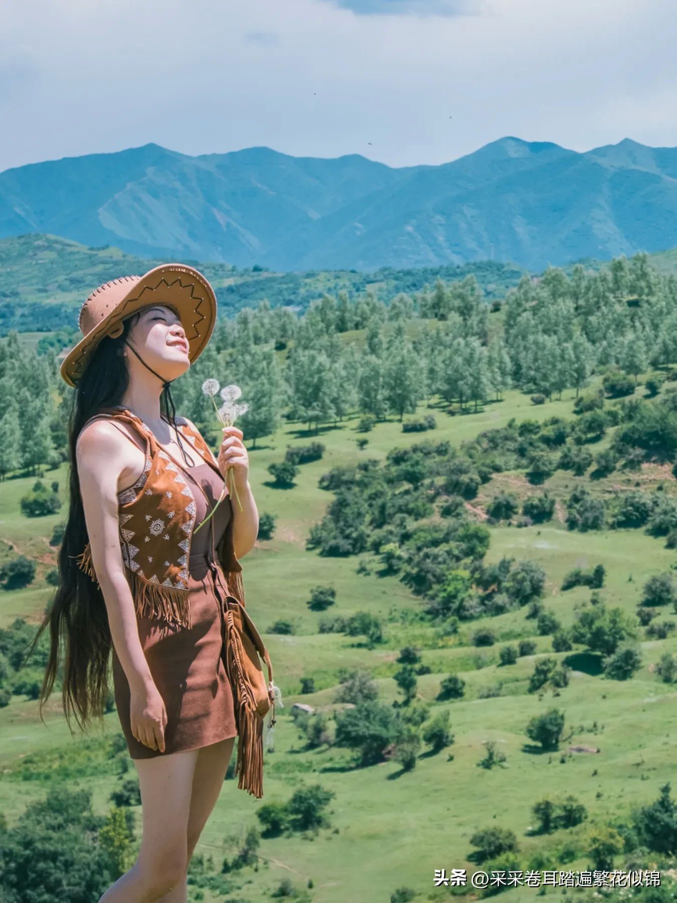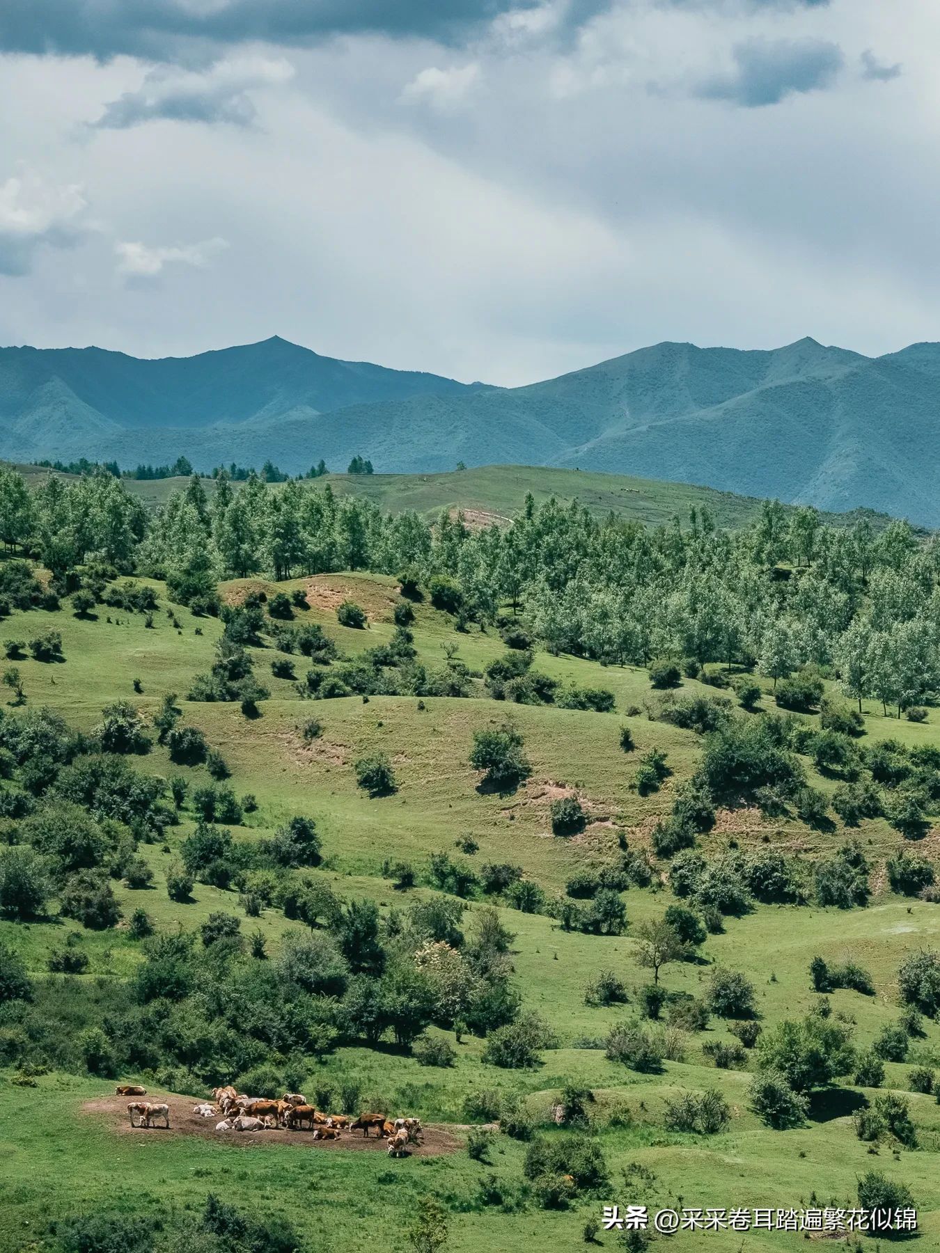 下车来到一块开阔的草甸高点,吹一朵蒲公英,让清风带着种子替我去感受蓝天的广阔、白云的悠闲、草原的起伏、森林的葳蕤、野花的鲜艳和牛羊的惬意。