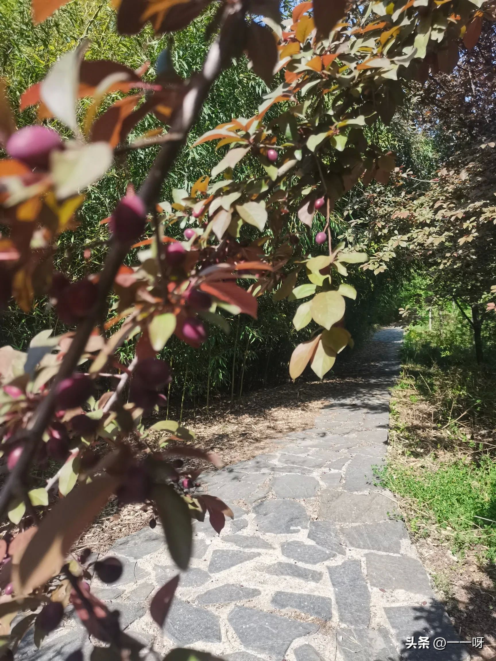 左转踏入林中漫步道,不算干净却也平添了几分野趣漫步其间,天上飞机低鸣和着远处传来除草剂的嘈杂声,愈发显出此处的幽静。正午的阳光洒落林间,透出斑驳的光影,地上的热浪向上翻涌,又被林中吹来的凉风压下去…满地的松针和松果是意外之喜,还有那不甘寂寞的紫李,将累累嫩果的枝条伸到路中央…