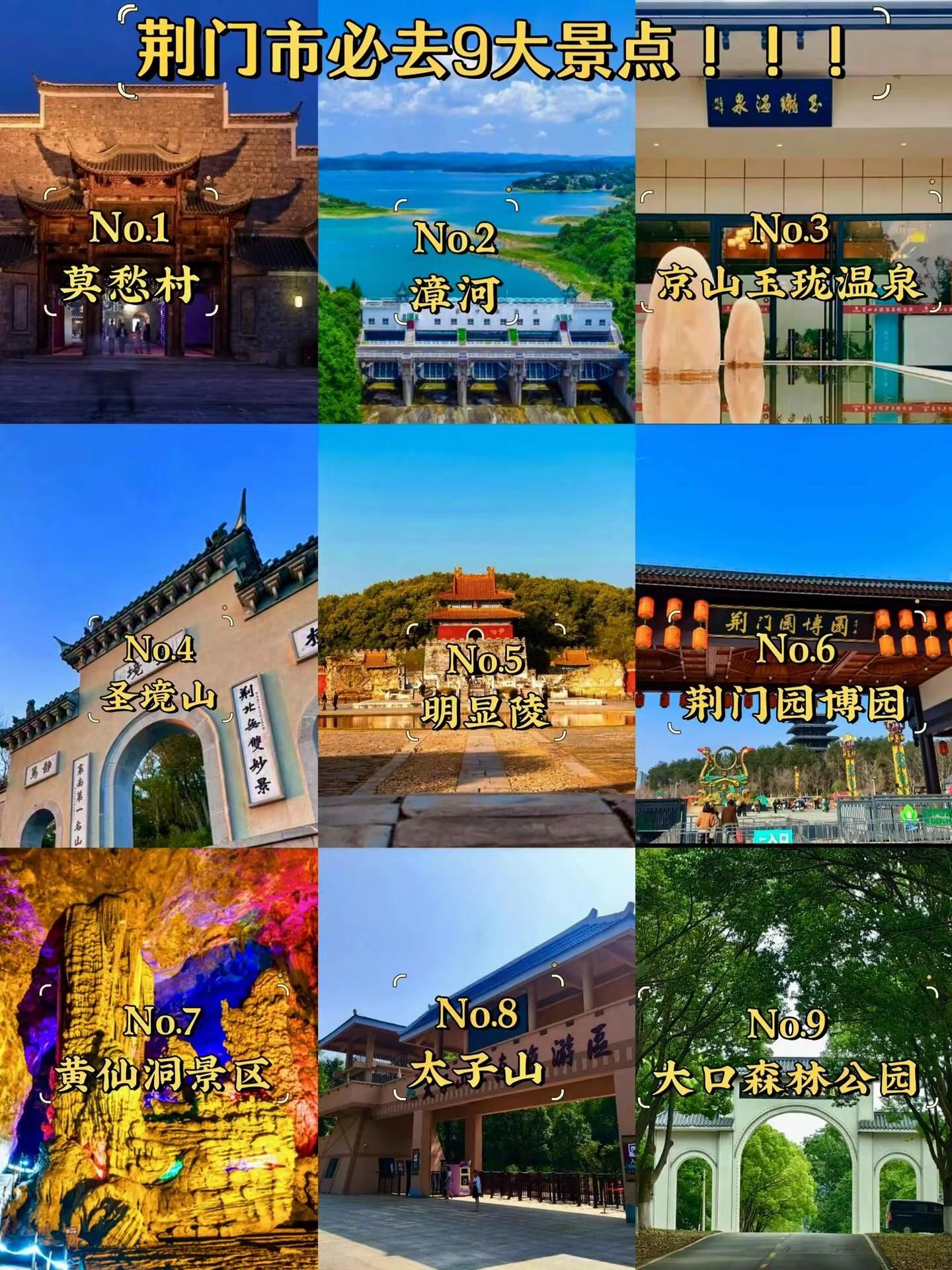 荆门必去9大景点荆门旅游必看。荆门素有“荆楚门户”之称。从5000年前的农耕文明摇篮,到划时代的通用航空新城。荆门这座“魅力之城”既是湖北省历史文化名城 ,也是中国优秀旅游城市。1. 莫愁村:湖北省荆门市钟祥市莫愁湖路59号(明显陵):00:00-24:00:免费开放2. 漳河:湖北省荆门市东宝区漳河镇漳河风景区旅游码头:08:30-17:30:成人票/110元3. 京山玉珑温泉:湖北省荆门市京山市温泉新区景观大道岭尚山河内:10:00-23:00:成人票/75元4. 圣境山风景区:湖北省荆门市东宝区013县道:00:00-24:00:免费开放5. 明显陵:湖北省荆门市钟祥市显陵路特1号:08:30-17:00:成人票/65元6. 荆门园博园:湖北省荆门市掇刀区天山路10号:09:00-19:00:成人票/50元;优待票/25元7. 黄仙洞景区:湖北省荆门市钟祥市客店镇大洪山风景区内:08:30-17:00:成人票/70元8. 太子山生态旅游区:湖北省荆门市京山市石龙镇太子山:08:30-17:30:成人票/37元;优待票/18元9. 大口国家森林公园:湖北省荆门市钟祥市于大洪山名胜风景区南麓:08:00-17:00:成人票/35元关于美食:矮子馅饼、蟠龙菜、石牌豆腐、钟祥葛粉、八角雪枣、万寿羹、长湖鱼糕、荆门风干鸡、青花椒煮胖头鱼、农家蒸笼格子、秘制排骨香肠、腊蹄子火锅、栗溪熏肉#周边游 #湖北旅游 #荆门旅游 #旅游 #五一去哪儿