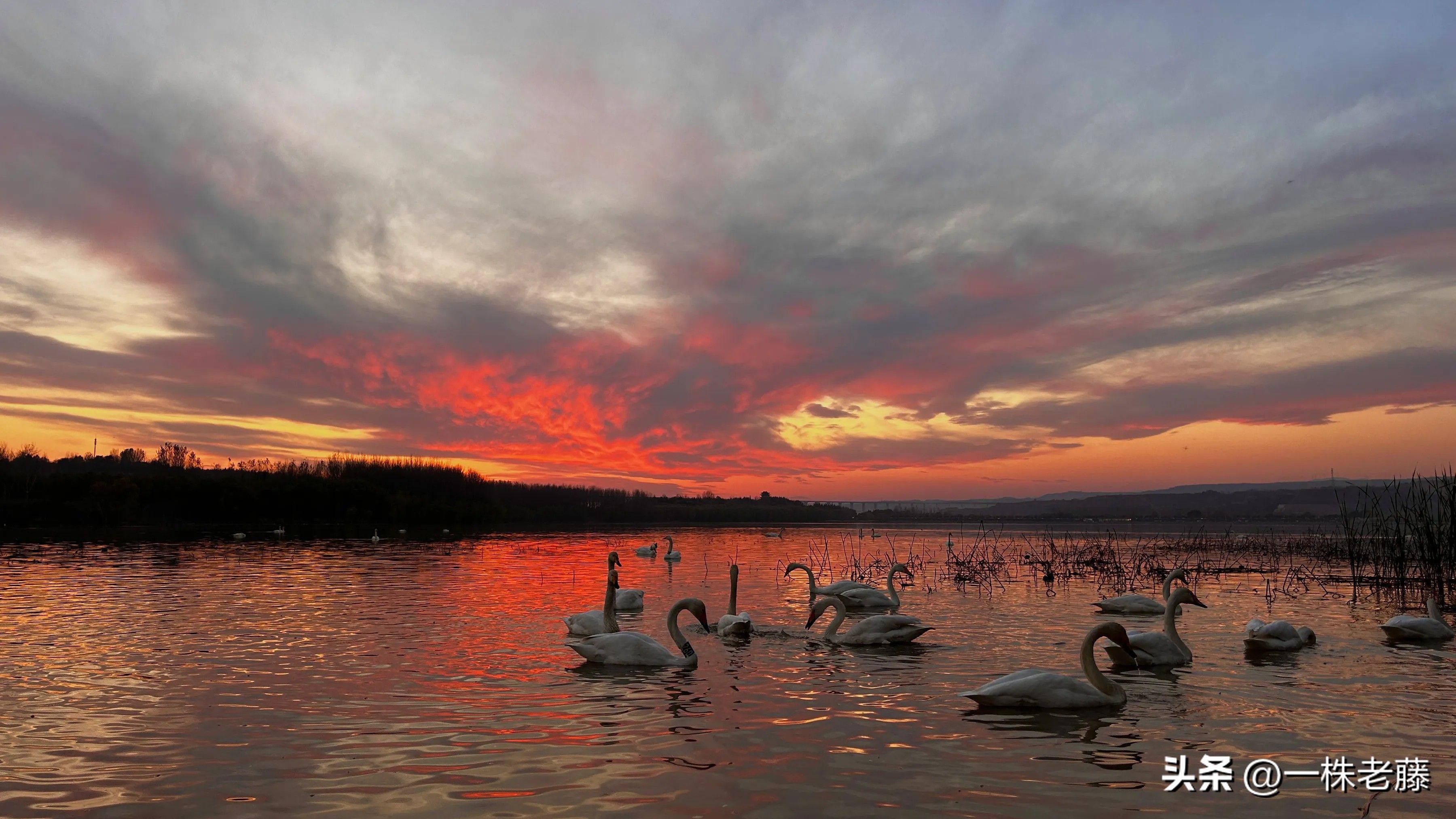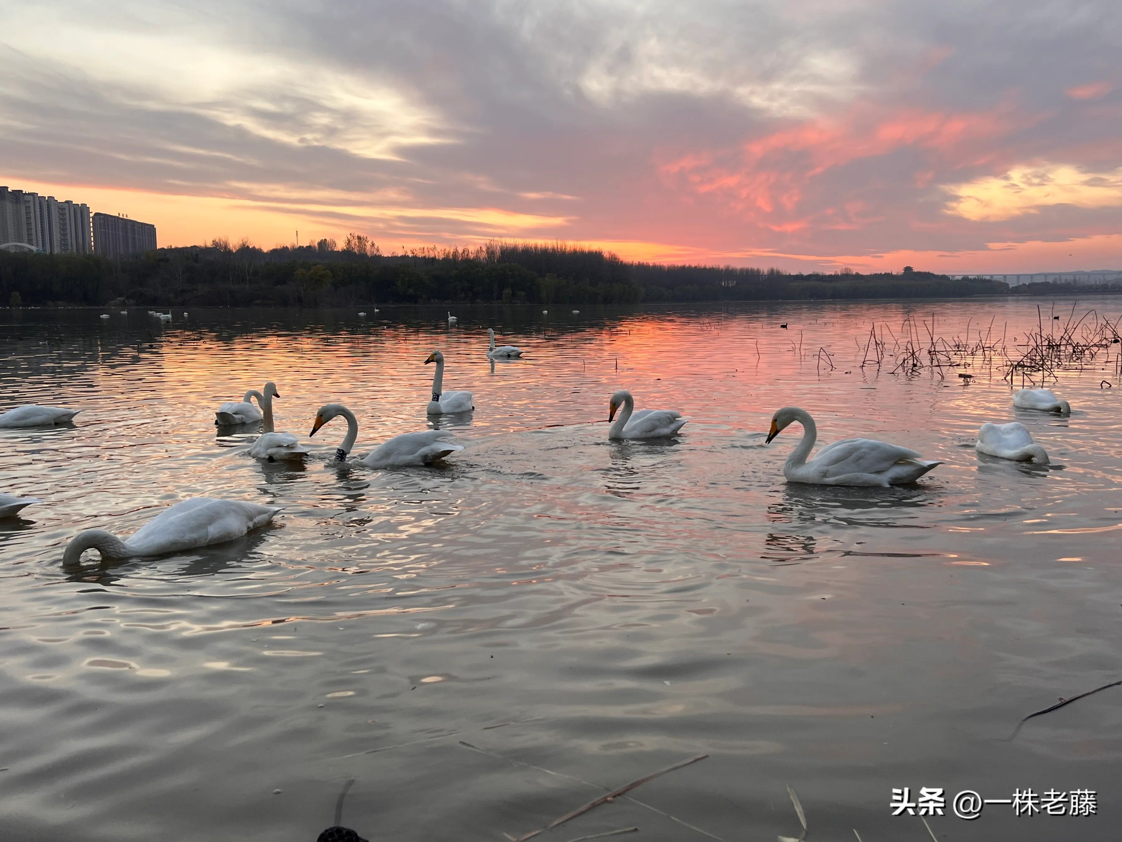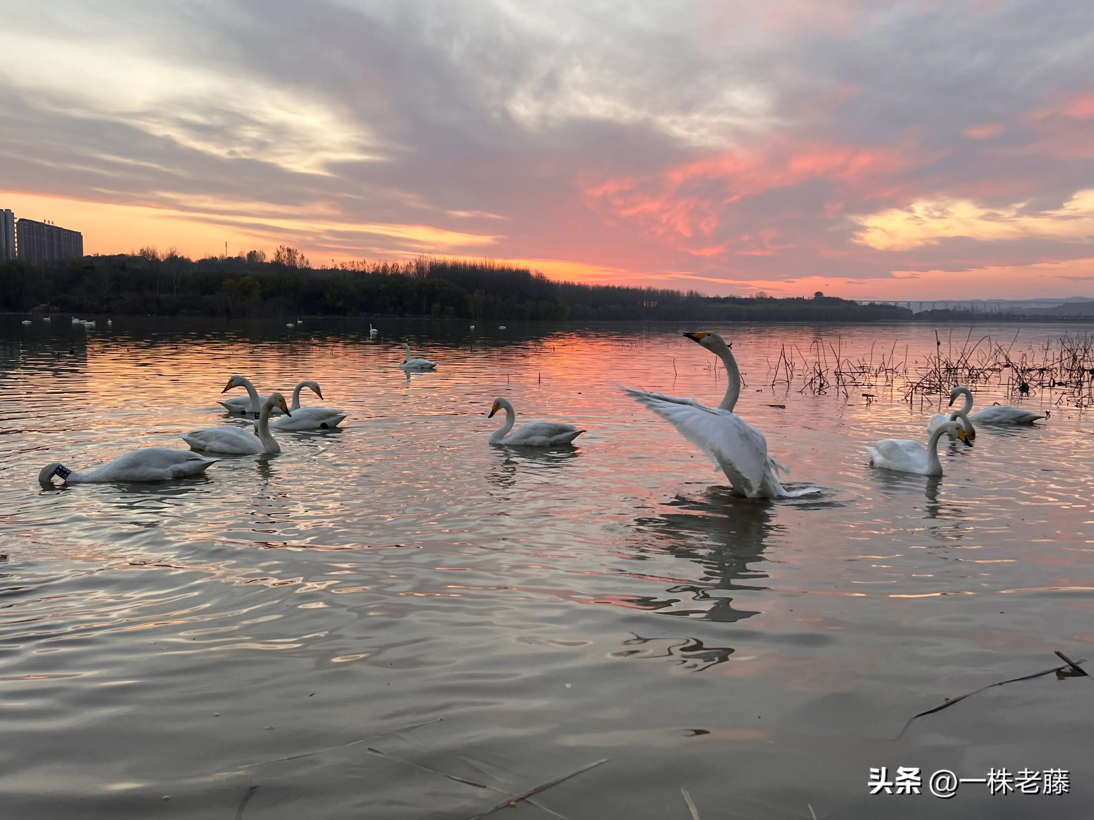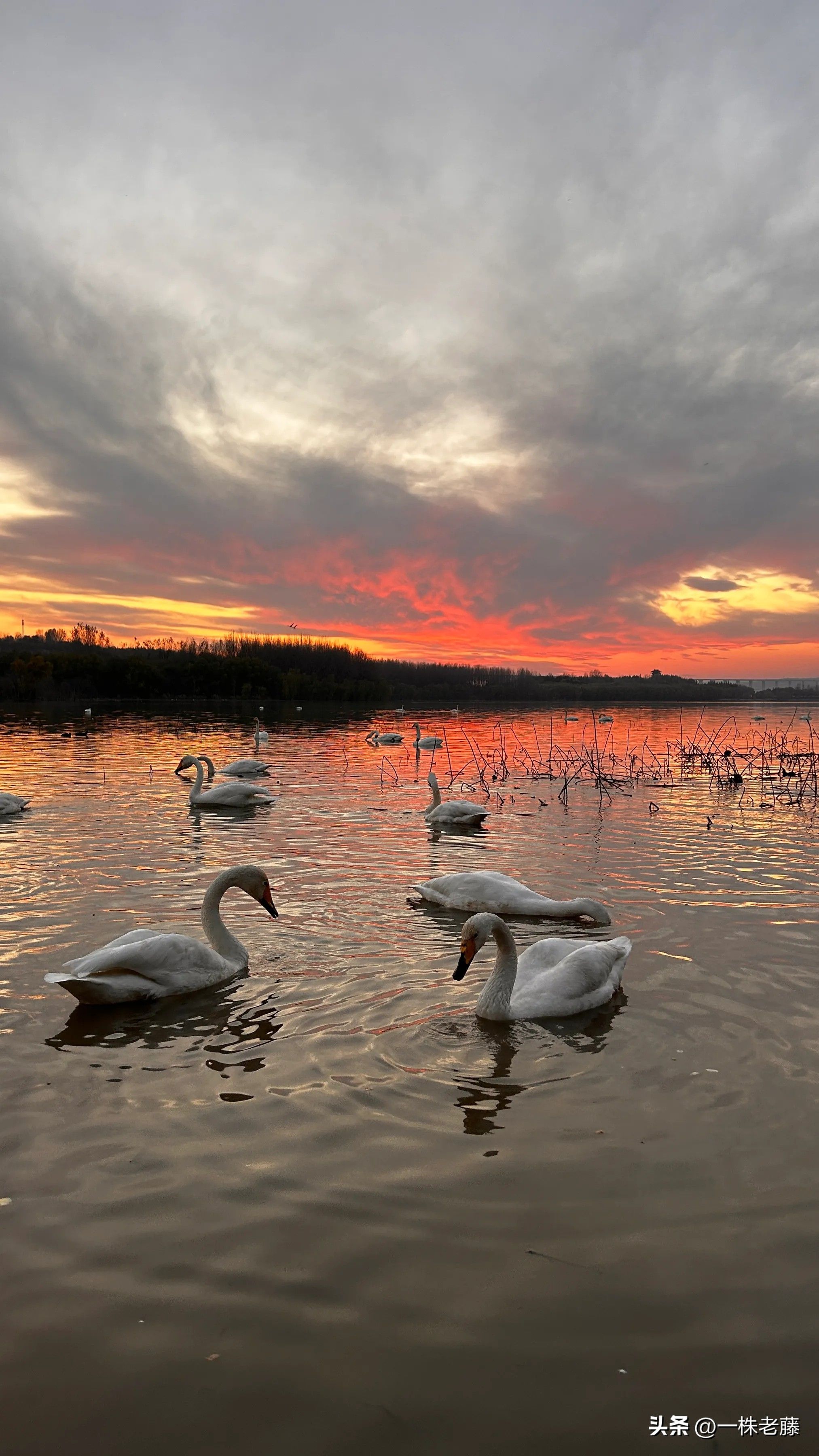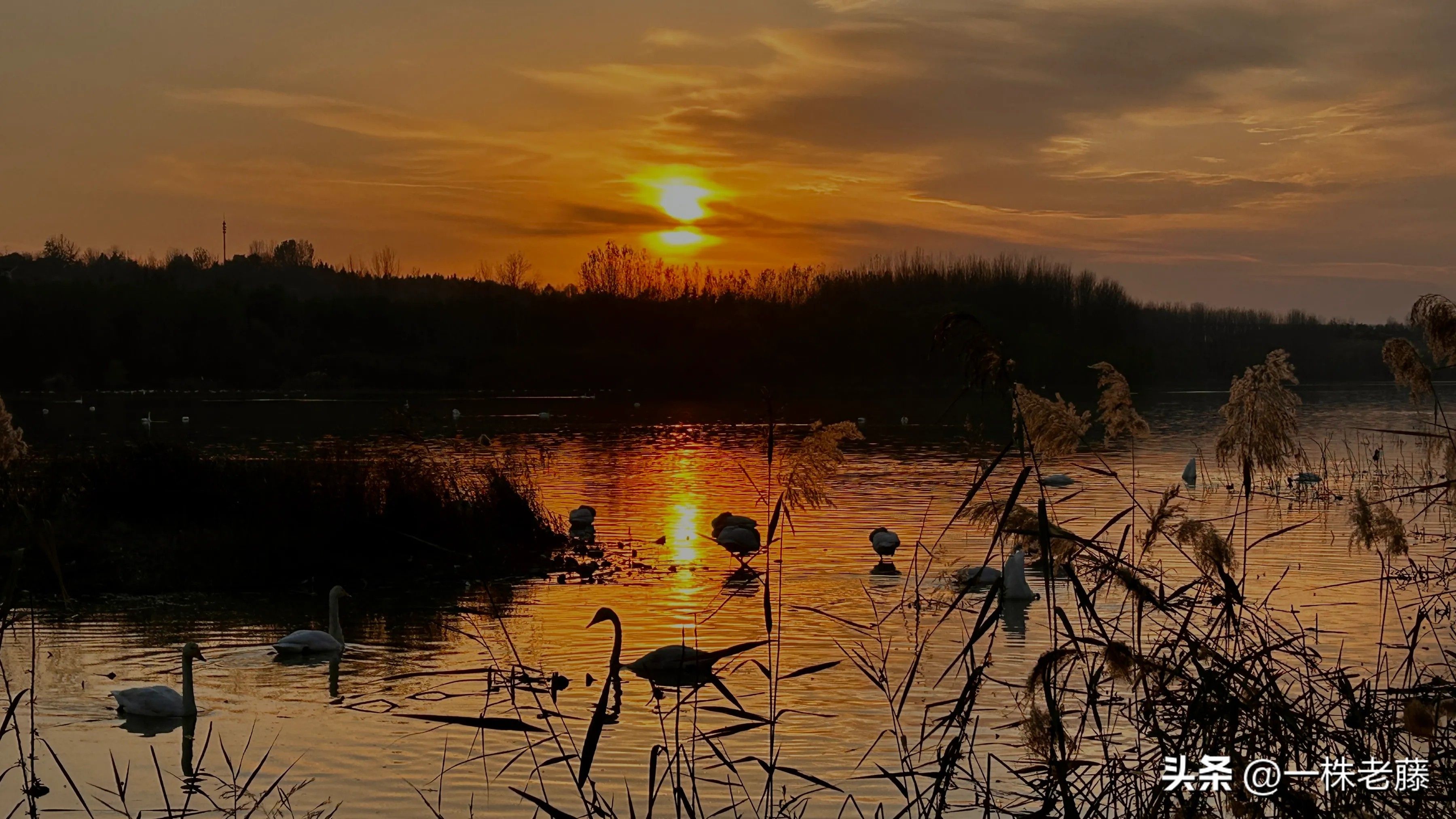 第四站:赏日落。今天天气特别好,看了天气预报日落时间是5点20,我们4点50到达天鹅湖公园东门,时间刚刚好,夕阳西下,天空渐渐染上了橙黄色的余晖,湖里的白天鹅在夕阳的映照下更显优雅,夕阳、芦苇、白天鹅,如诗如画,让人沉醉在这美丽的色彩中,感受大自然的魅力与温暖。