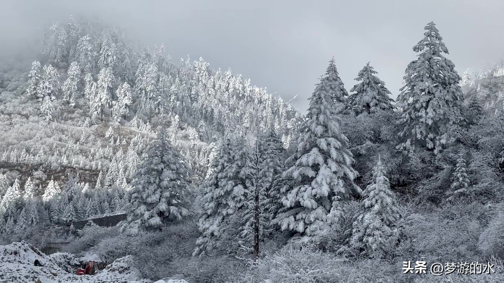 由于云层较厚,和去年七月经过贡嘎雪山大桥时一样,我们依然没能见到远处的蜀山之王贡嘎山,而随着海拔的升高,积雪逐渐覆盖了整个路面,在这样的道路上行驶一定要多加小心,该装防滑链就装,不要抱侥幸心理。