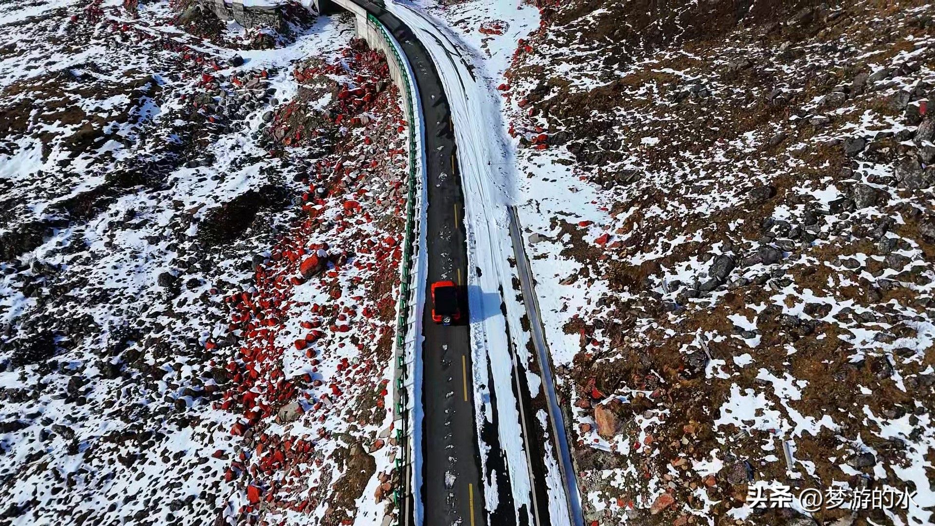 从磨西镇出发时,阳光还照耀着大地,这里有大名鼎鼎的海螺沟景区,当年红军长征时,还曾在磨西召开著名的“磨西会议”,部署“飞夺泸定桥”等重要战役。而后随着不断前行,路边逐渐出现红石,天气也慢慢改变,再后来,可见山林被白雪覆盖,路边的积雪新鲜而洁白……