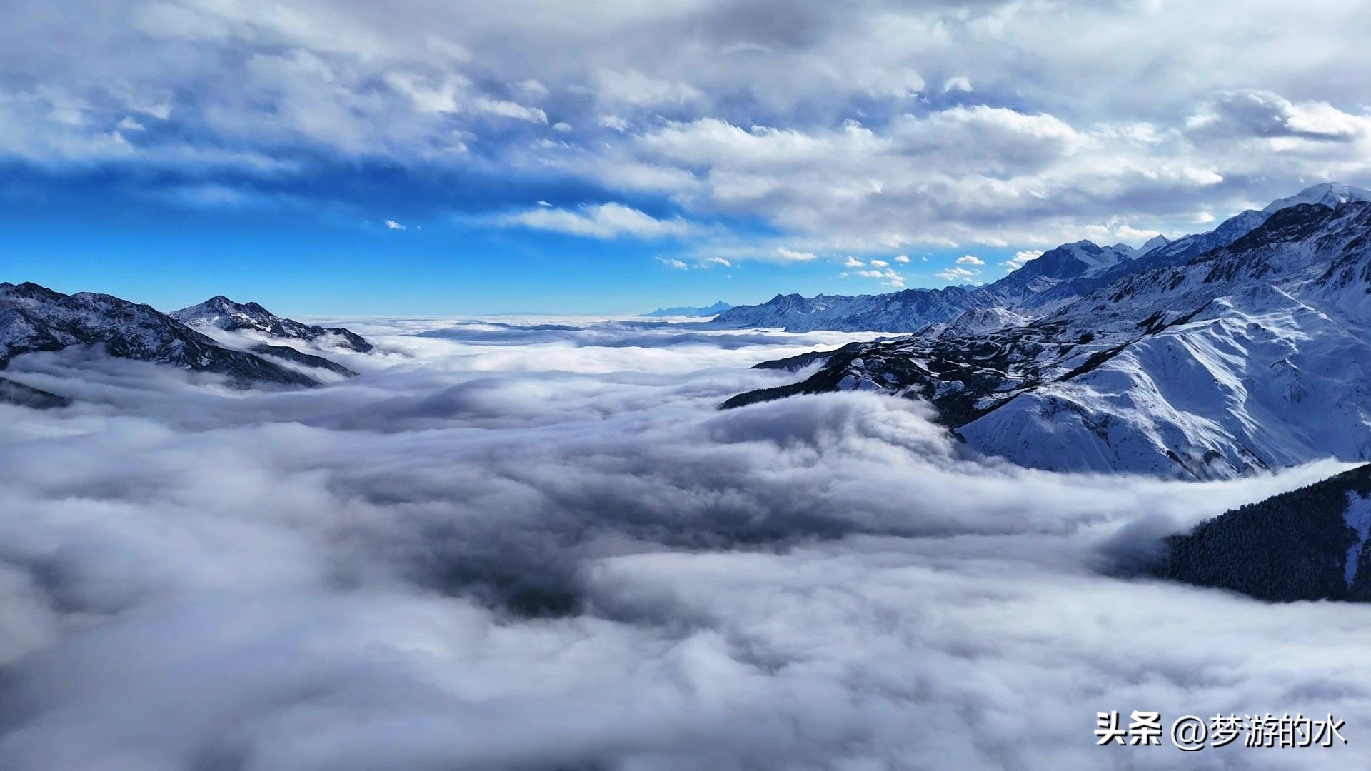 “不畏浮云遮望眼,自缘身在最高层”,在高处往远方眺望,可见云海苍茫,一望无际,雪山高耸,巍峨壮丽,一切宛如仙境。