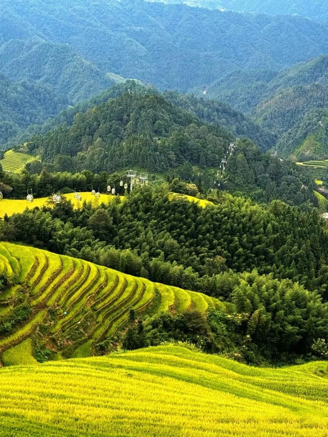 3号观景台「金佛顶」坐缆车(山底乘坐),俯瞰金色稻浪与瑶族村落