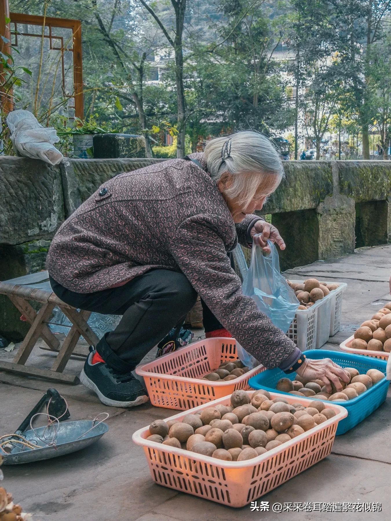 此时人物成为画面中央的一点鲜亮。若有当地人背物穿过,则又构成一副水乡人文图。