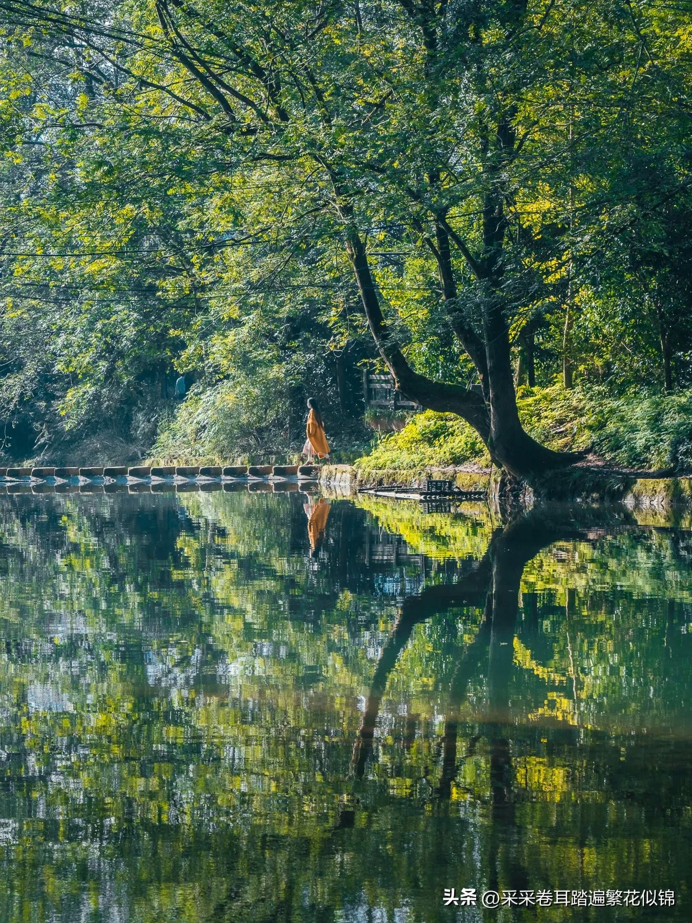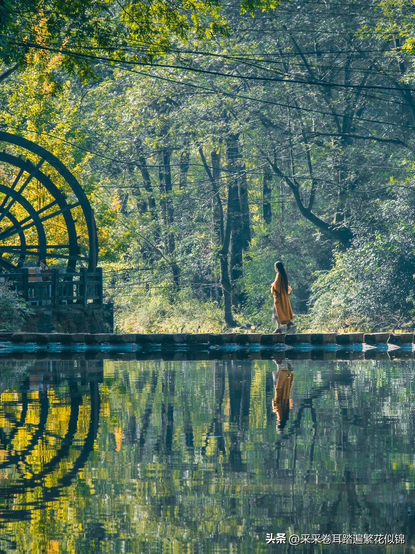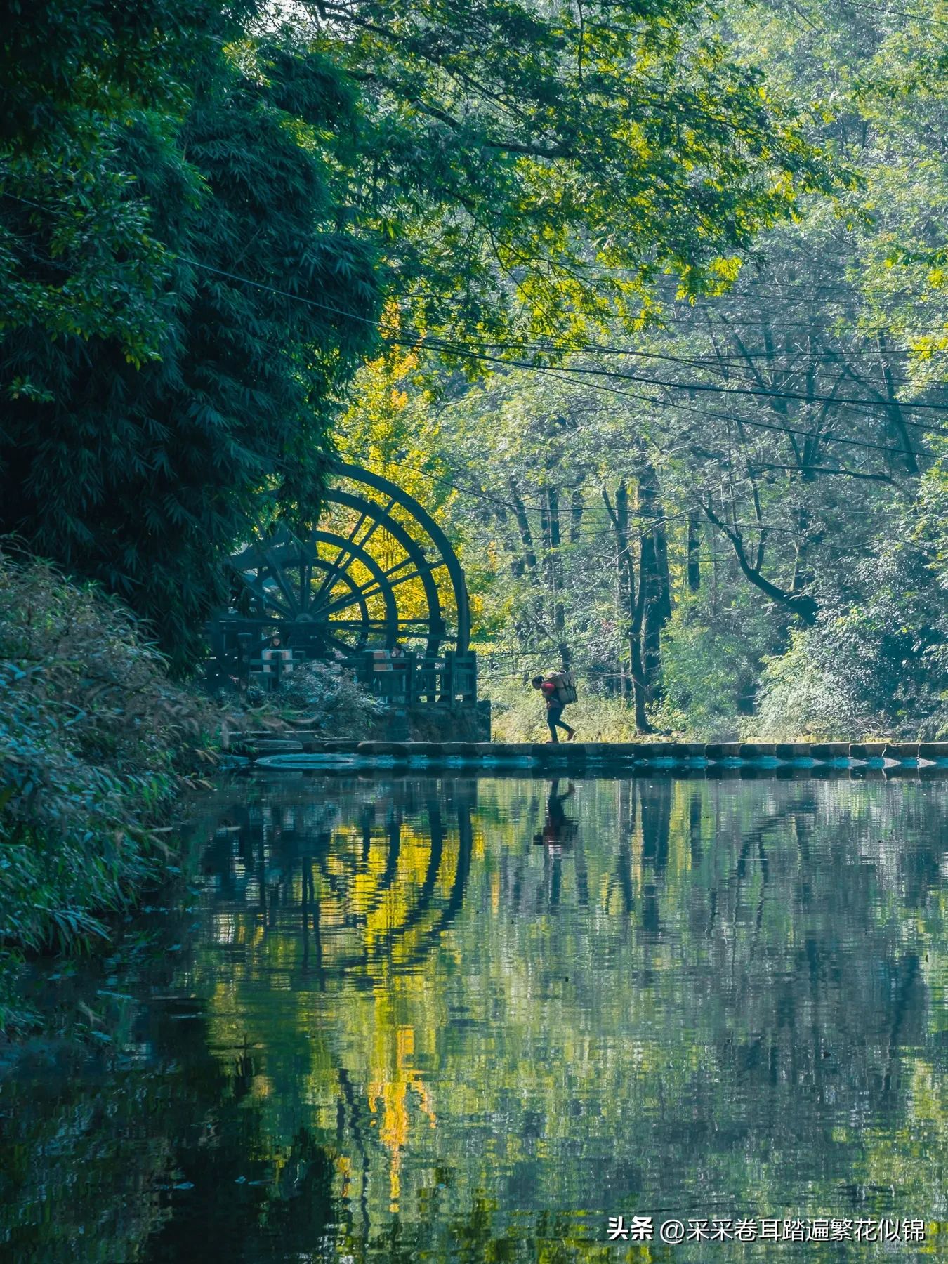 拍摄者站在靠近水车一边的主路上,被拍摄者走到跳岩中间。时间要选在上午,因为此时阳光穿透跳岩背后的茂密树林。被树荫柔和了的光芒倾泻到河面跳岩与附近水车上,将这些古镇元素融合为一副绝美的画卷。若有秋色加持更美,当然春夏的绿荫也不错。