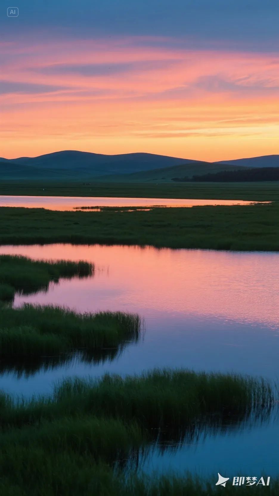 将军泡子(必去!):草原湖泊倒影晚霞,骑马踏水溅起水花