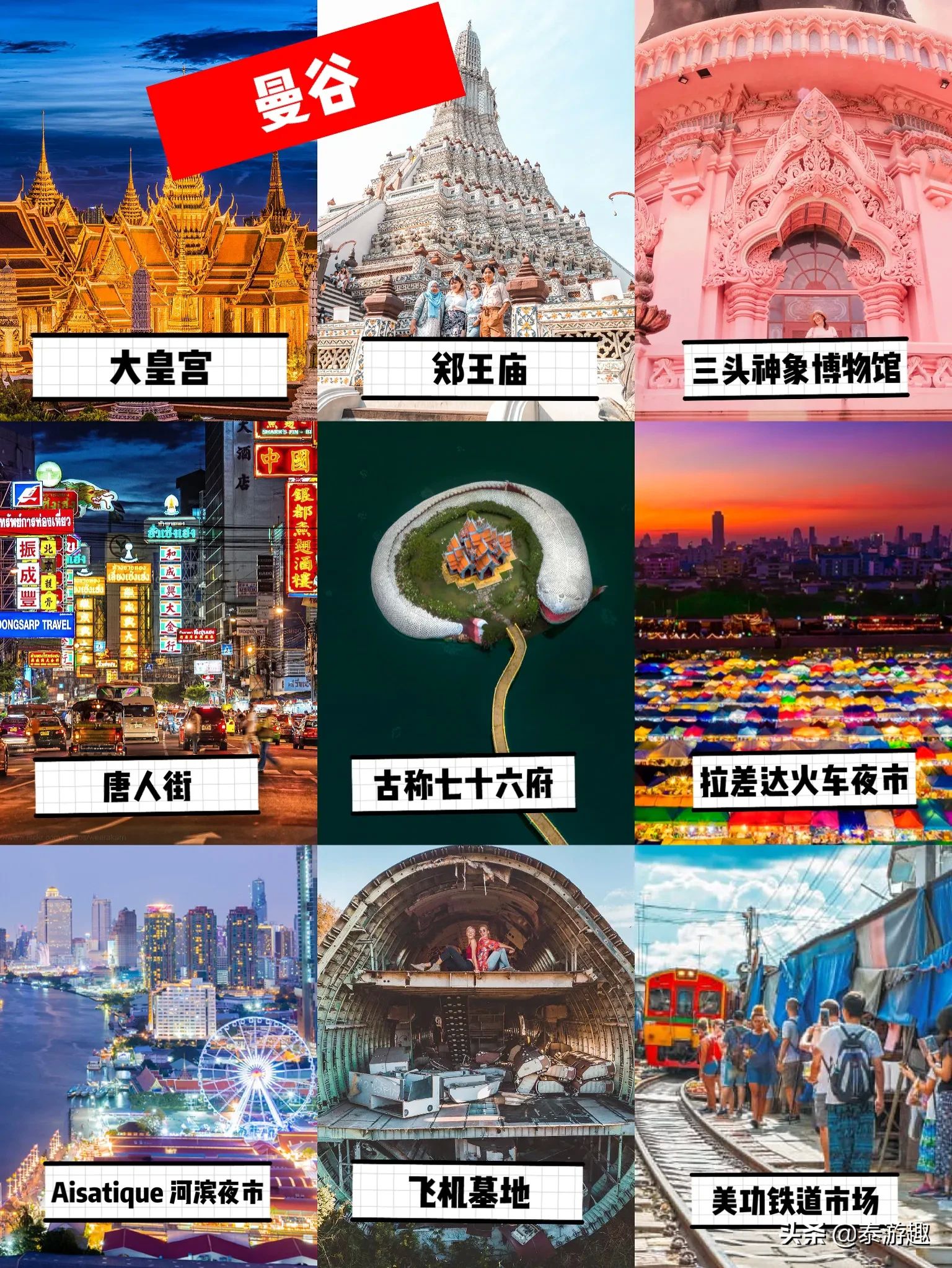 曼谷:大皇宫(500铢),郑王庙(50铢),三头象神博物馆(700铢),唐人街,古城七十六府(700铢),拉差达火车夜市,Asiatique河滨夜市,飞机墓地(200泰铢),美功铁道市场