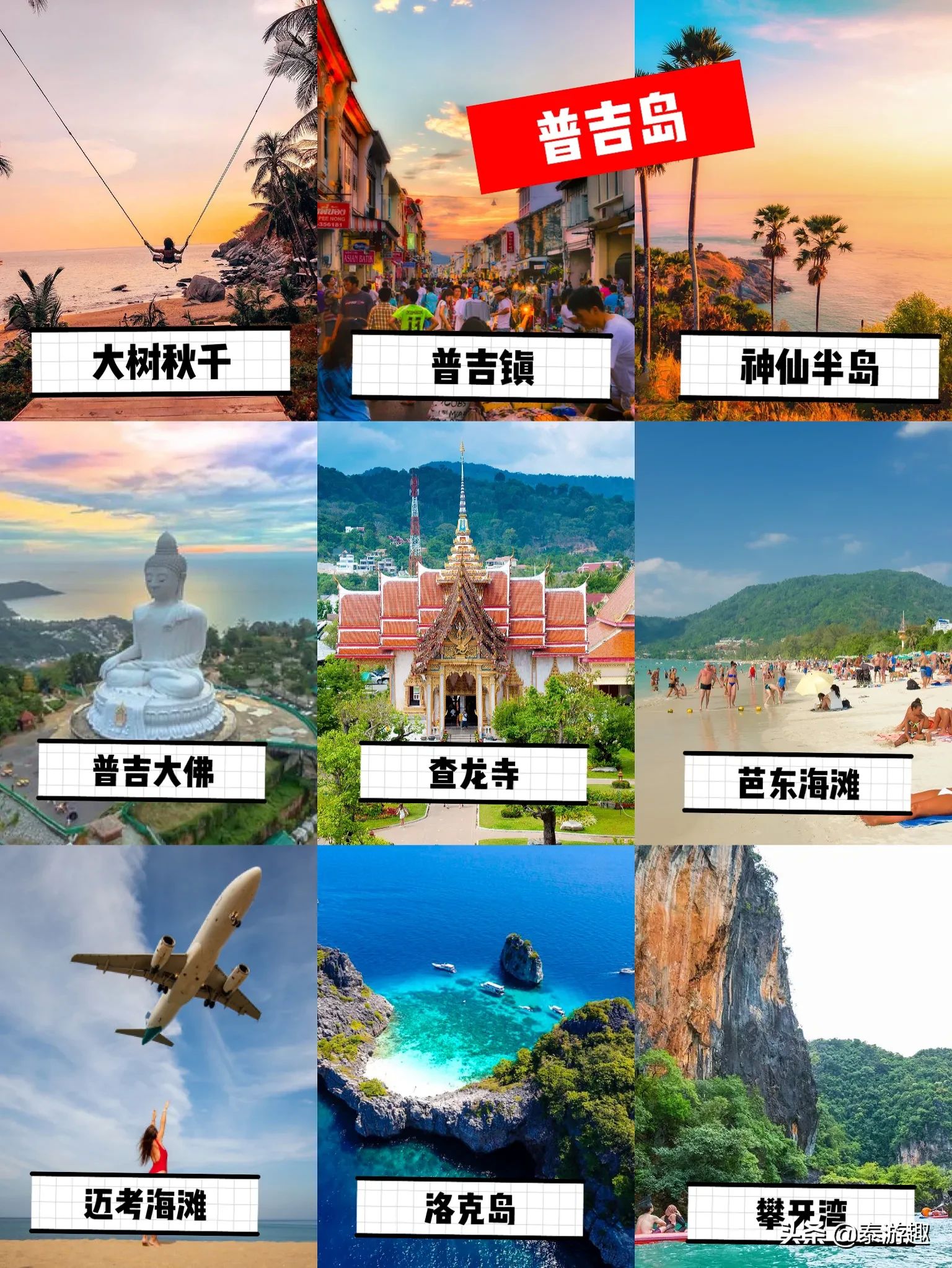 普吉岛:大树秋千 (169元),普吉镇,神仙半岛,普吉大佛,查龙寺,芭东海滩,卡伦海滩 ,迈考海滩,跳岛游(斯米兰岛,洛克岛,攀牙湾,皮皮岛,蛋岛)