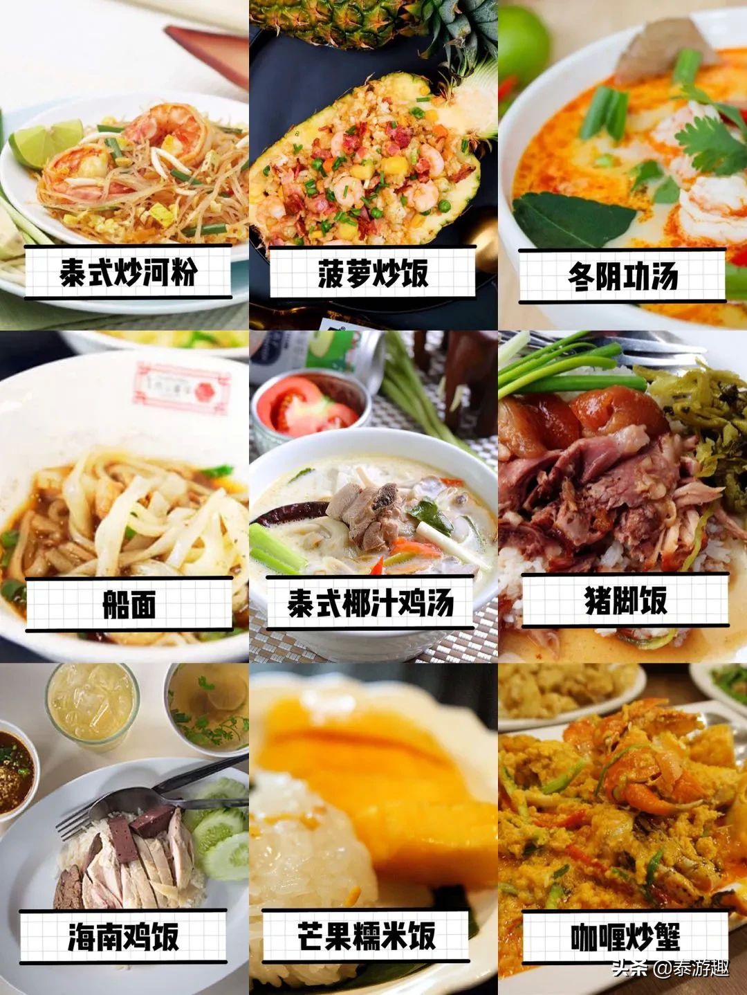 美食:泰式炒河粉、菠萝炒饭、冬阴功汤、船面、青木瓜沙拉、泰式椰汁鸡汤、猪脚饭、海南鸡饭、芒果糯米饭、咖喱炒蟹、香蕉煎饼、椰子冰淇淋 、泰式奶茶...