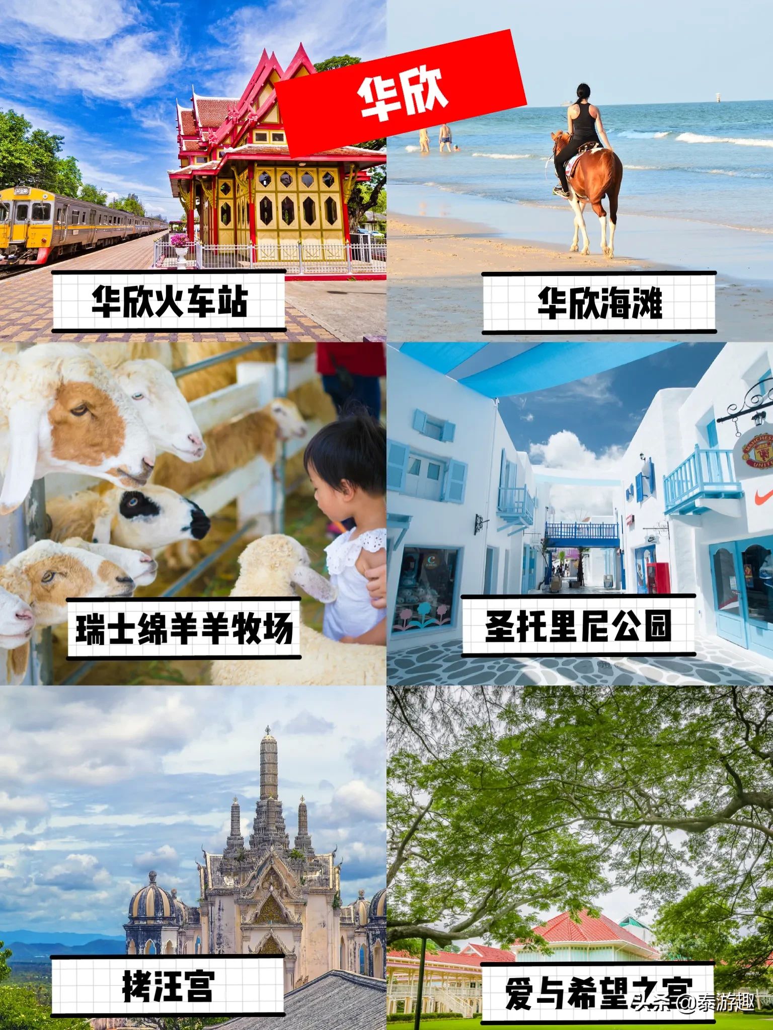 华欣:华欣火车站,华欣海滩,圣托里尼公园(150铢),瑞士绵羊牧场(40元起),爱与希望之宫