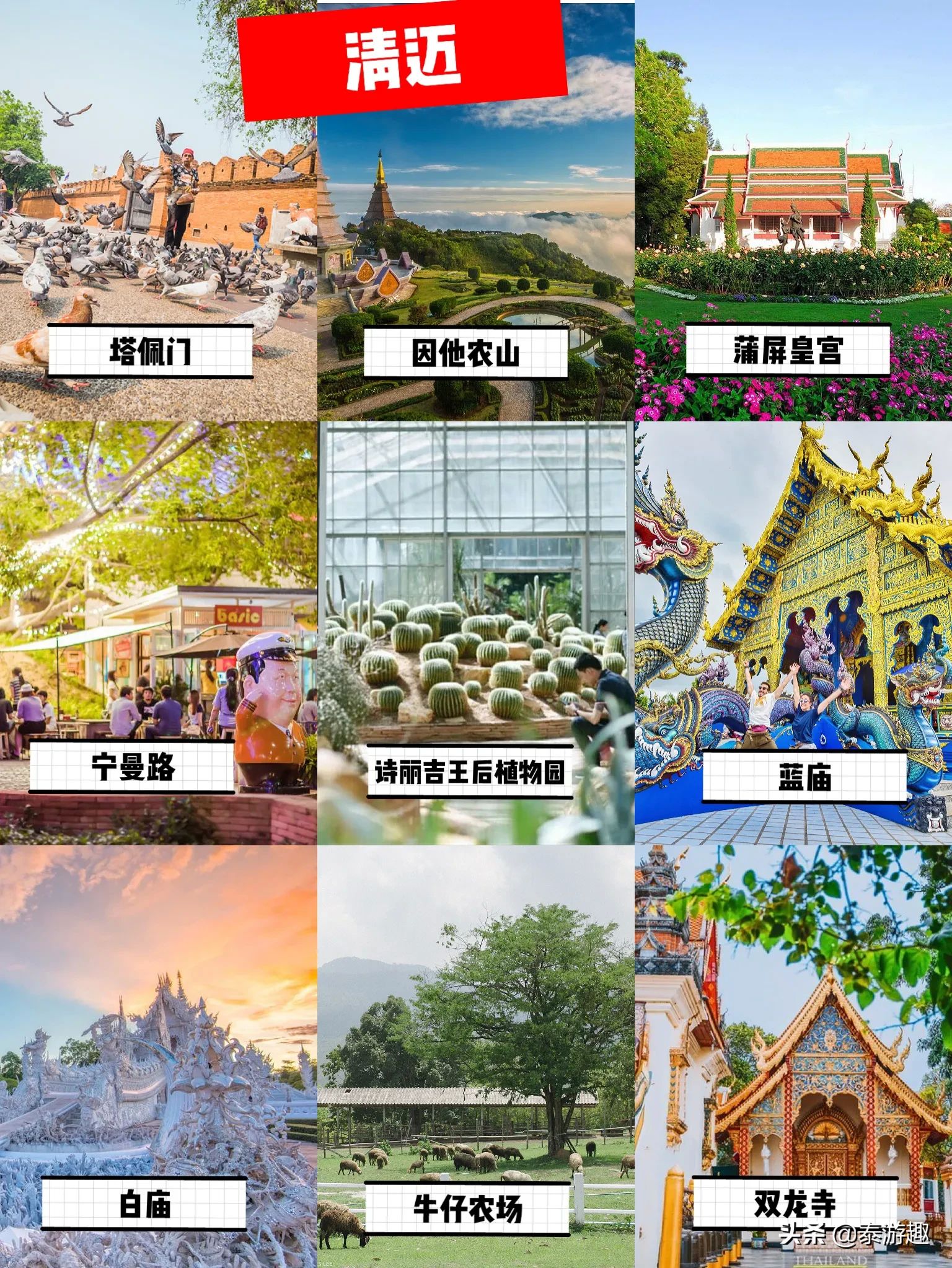 清迈:塔佩门,因他农山,蒲屏皇宫(50铢),宁曼路,诗丽吉王后植物园(100铢),牛仔农场,蓝庙,白庙(50铢),双龙寺(30铢)