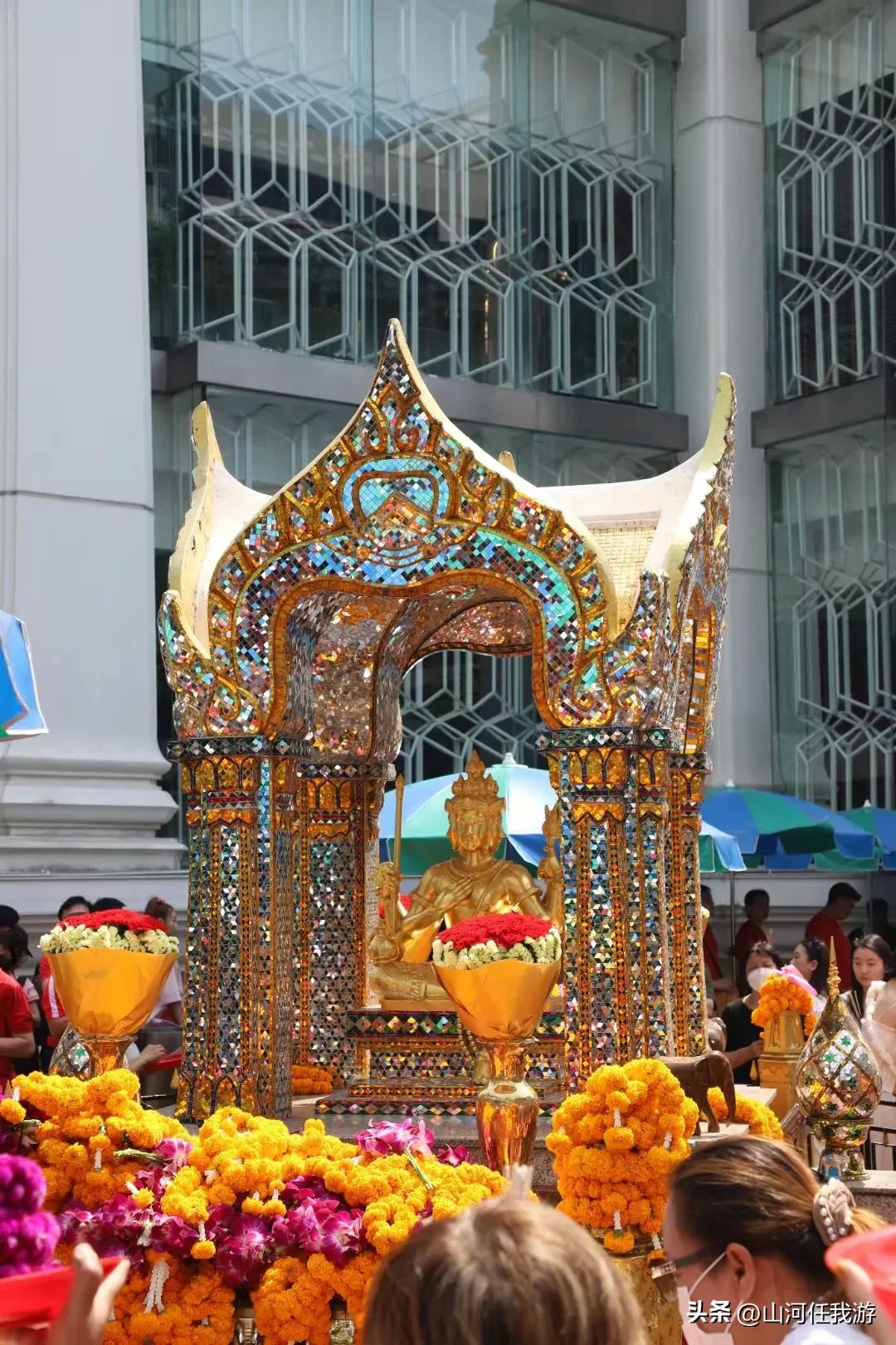 四面佛(图12-13)位于泰国曼谷市中心商业区,在泰国被称之为有求必应佛,是曼谷著名的观光名胜,每天都有来自世界各地的信徒前来许愿朝拜,是泰国香火最旺的佛像之一。神像的前后左右有四副面孔,代表慈、悲、喜、舍四种梵心。也有其它说法,说代表爱情、事业、健康和财运。