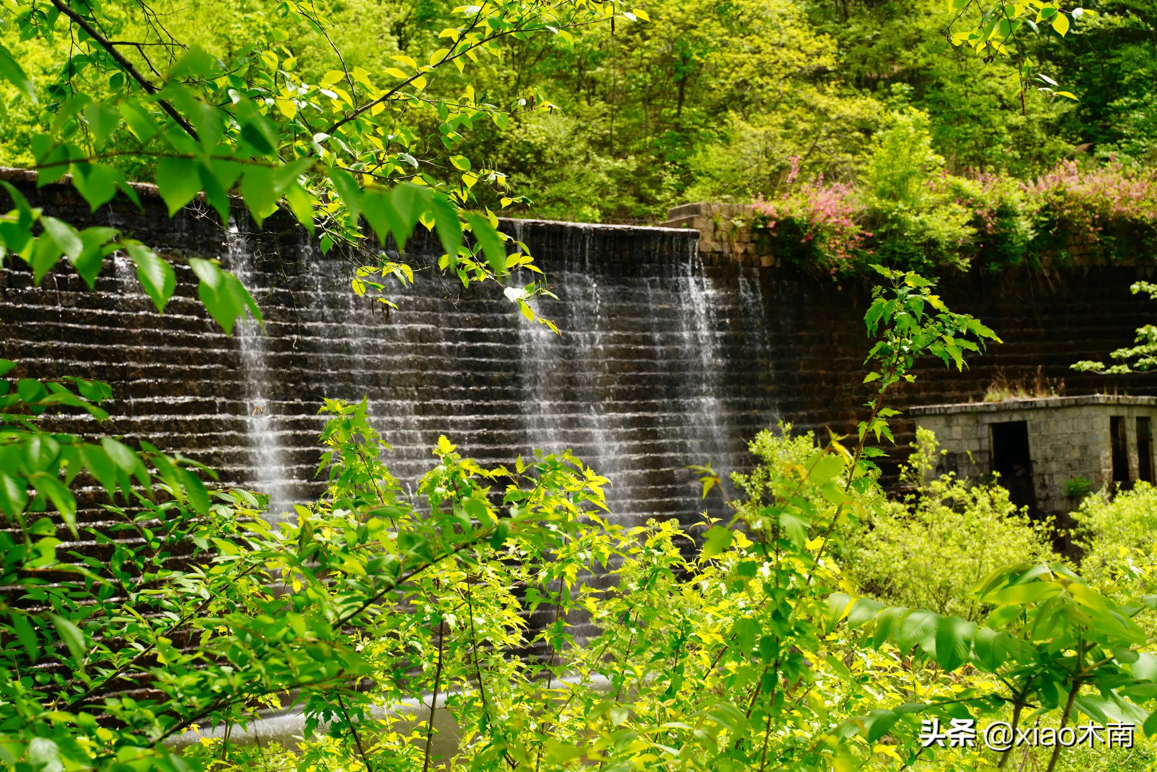 继续攀爬,来到最高点——石湖水库。这是一座人工修建的水库,湖面平如镜,湖岸村舍错落,犹如世外桃源,弧形的水库大坝造型独特,湖水自顶端崖口处倾泻而下,形成落差高达15米,水流翻滚,喷珠溅玉,湖水沿着石面倾泻,甚是壮观。#自驾好去处 转动好时节#