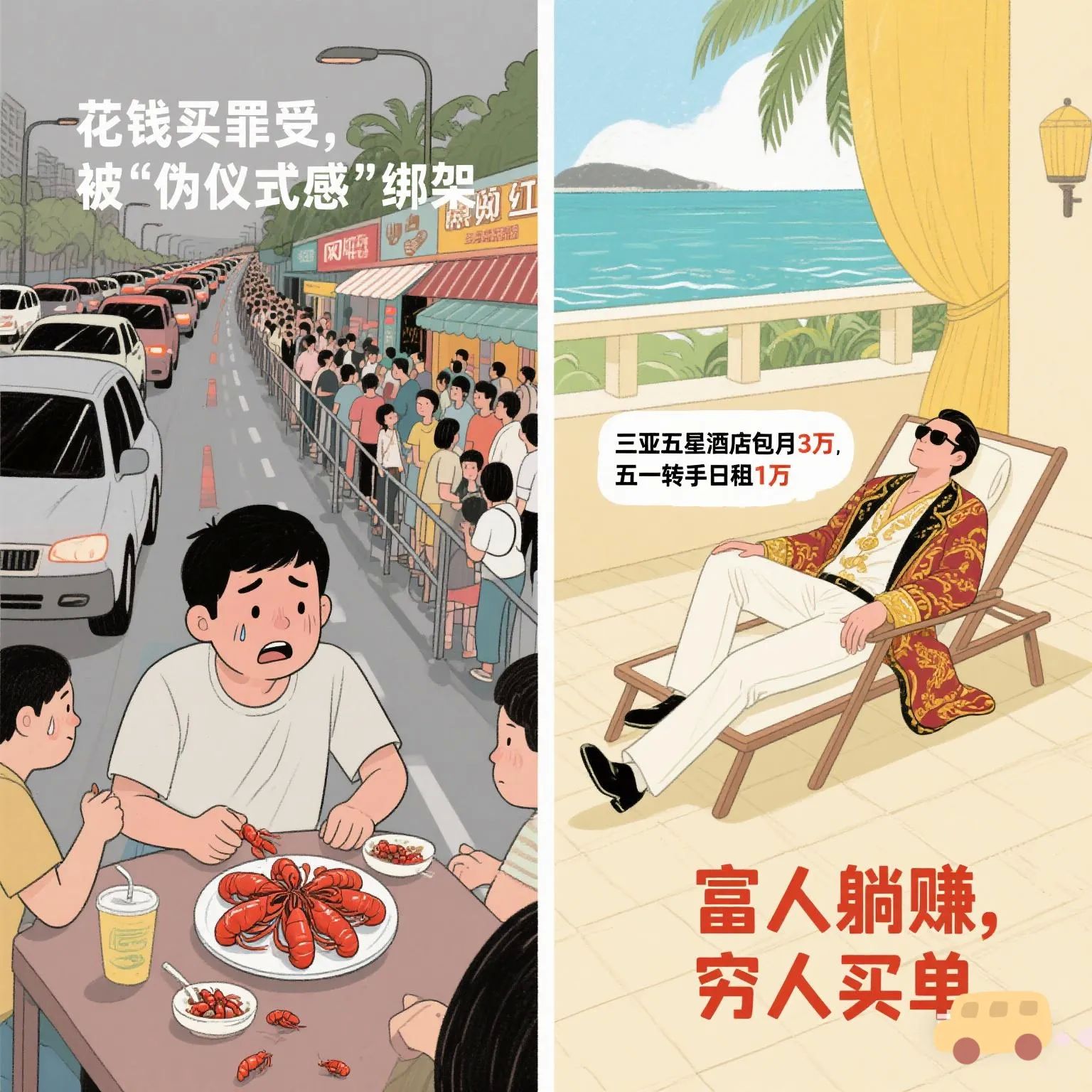 被“伪仪式感”绑架:网红餐厅等位2小时,上菜发现小龙虾比指甲盖还小;朋友圈晒旅行照成“硬指标”,实际体验一地鸡毛。