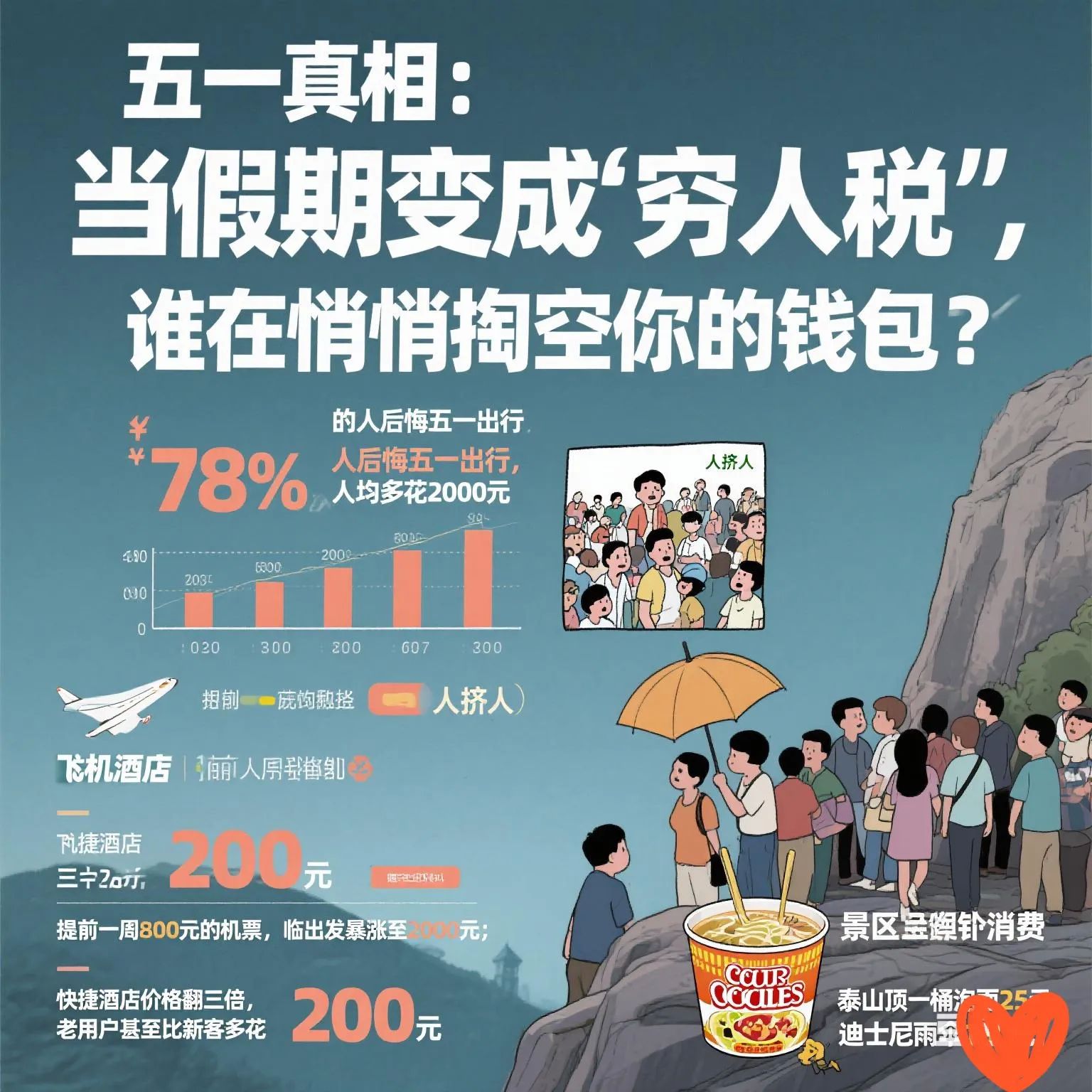景区消费离谱:泰山顶一桶泡面25元,迪士尼雨伞180元,商家吃准了游客“来都来了”的心理。
