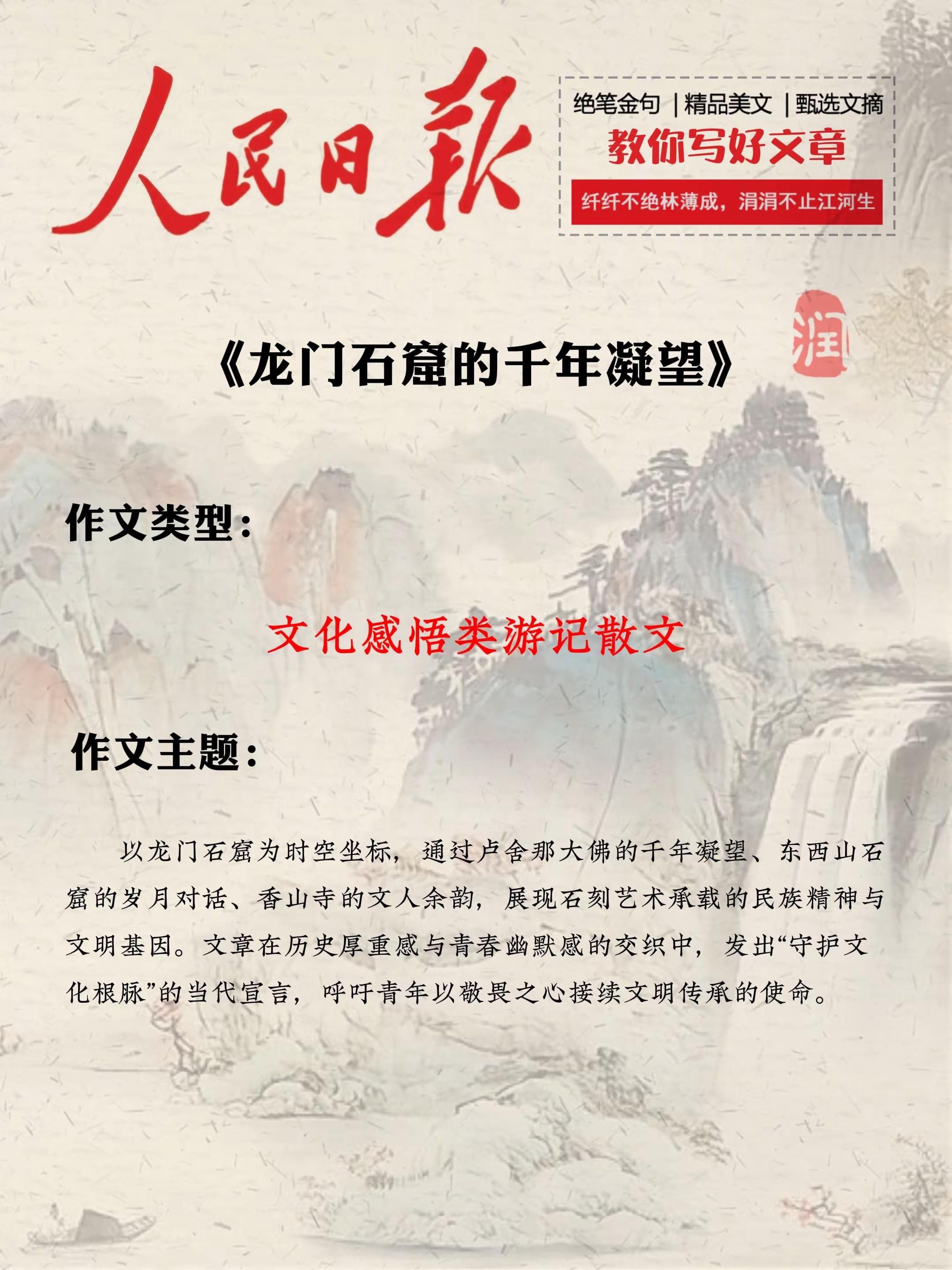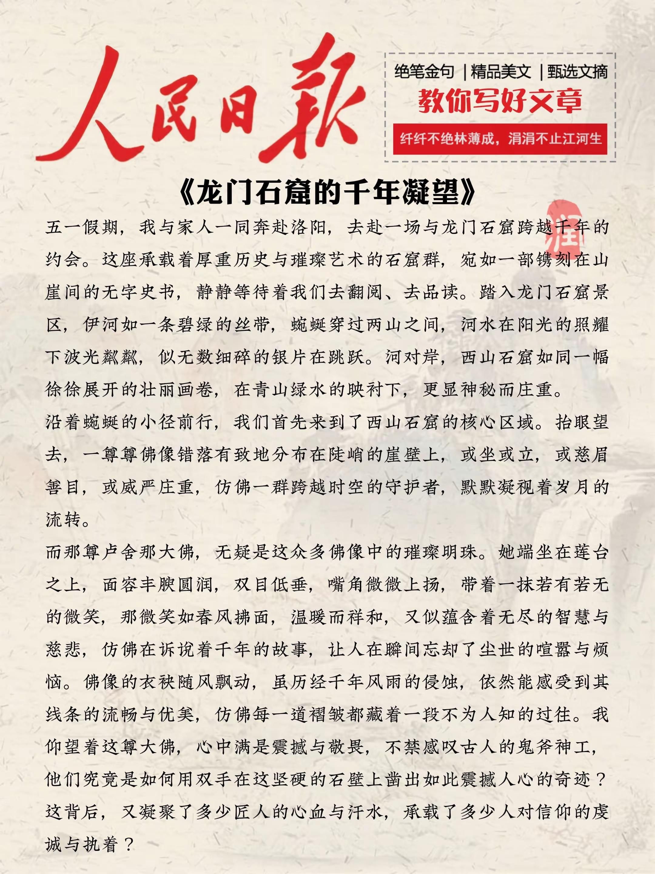《龙门石窟的千年凝望》写作大纲一、开篇:赴约千年,邂逅无字史书1. 意象定调:五一假期与家人奔赴洛阳,将龙门石窟喻为“山崖间的无字史书”,奠定文化寻根基调。2. 场景铺陈:伊河如碧绿丝带蜿蜒,西山石窟如画卷展开,以“青山绿水”与“神秘庄重”的对比,引出核心场景。二、主体:三重凝视,解码文明基因1. 西山石窟:匠心与信仰的交响 - 卢舍那大佛:聚焦“微笑”细节,以“春风拂面”喻慈悲,以“衣袂褶皱”藏岁月,引发对匠人精神的追问。 - 青春插曲:导游调侃“剪刀手”与游客笑声,将庄严与幽默并置,暗喻文化传承需虔诚与活力并存。2. 东山石窟:时光的两种刻度 - 斑驳与鲜活:模糊纹路如“老人皱纹”与鲜艳色彩似“时间凝固”,以触觉“粗糙质感”联结历史心跳。3. 香山寺:文脉的千年回响 - 古刹剪影:红墙青瓦、钟声香烟中浮现文人身影,以“花开枝摇”呼应“谈经论道”,将物质遗产升华为精神图腾。三、尾声:守护根脉,接力文明火种1. 黄昏顿悟:夕阳余晖中点明石窟的象征意义——不仅是艺术瑰宝,更是民族精神的“根与魂”。2. 危机警示:直面风化侵蚀与人为破坏,以“接力赛”喻传承使命,用“不能让古人遗憾”强化责任意识。3. 行动宣言:化用古语“固根本”“浚泉源”,将保护文物升华为守护精神家园,以“携手共进”收束,呼应开篇“赴约千年”的青春朝气。 #五一劳动节 #游记作文 #假期旅游 #游记作文素材 #初中作文