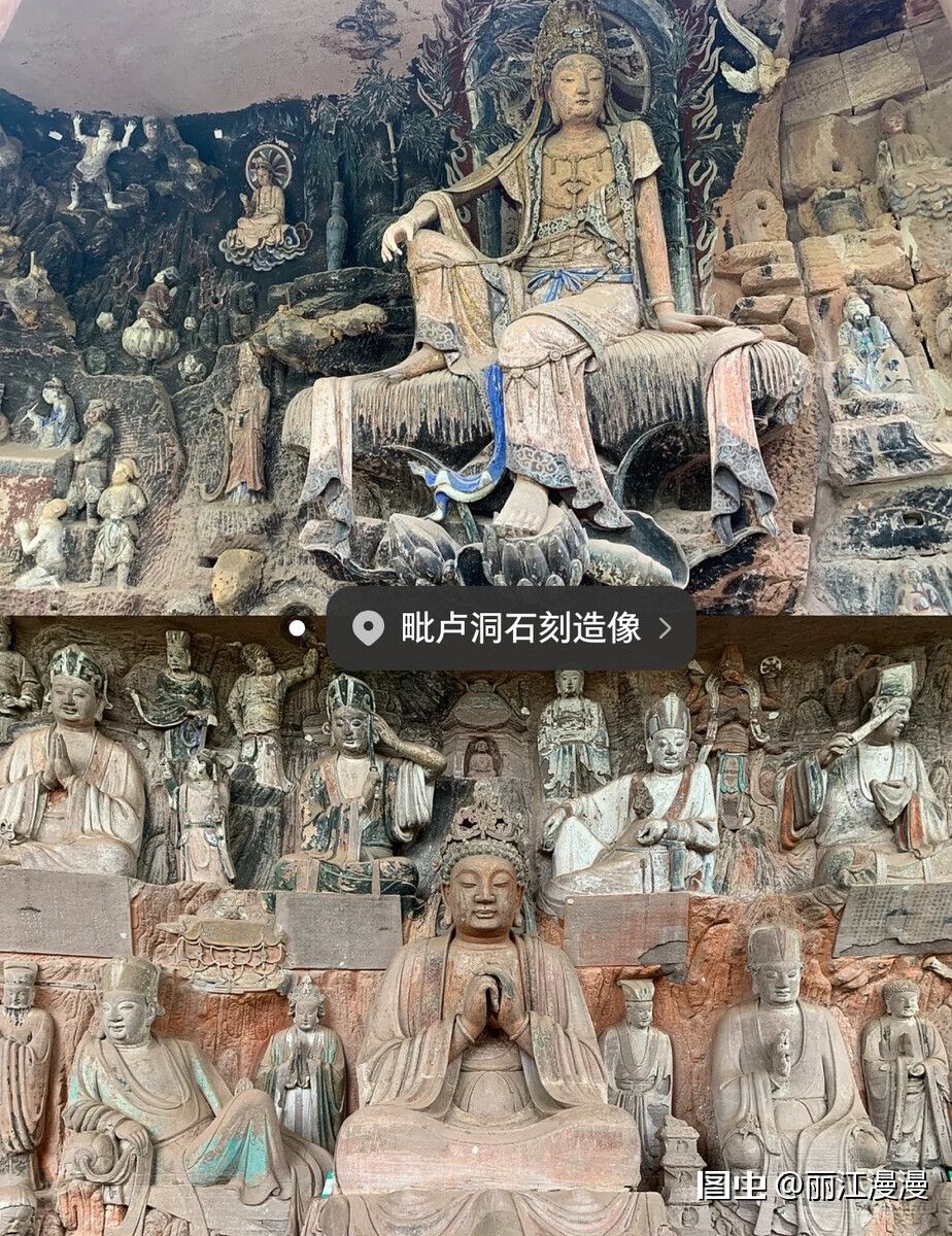 ?圆觉洞:始于唐代,盛于五代、北宋,因有北宋时期开凿石洞雕刻十二圆觉而得名。目前以“西方三圣”最为壮观,分别刻造于三大龛中。三像高均在7米左右,面目俊俏,体姿放逸,比例协调,装饰繁华。分别为阿弥陀佛(左下),莲花手观音(右上)和净瓶观音(右下)。