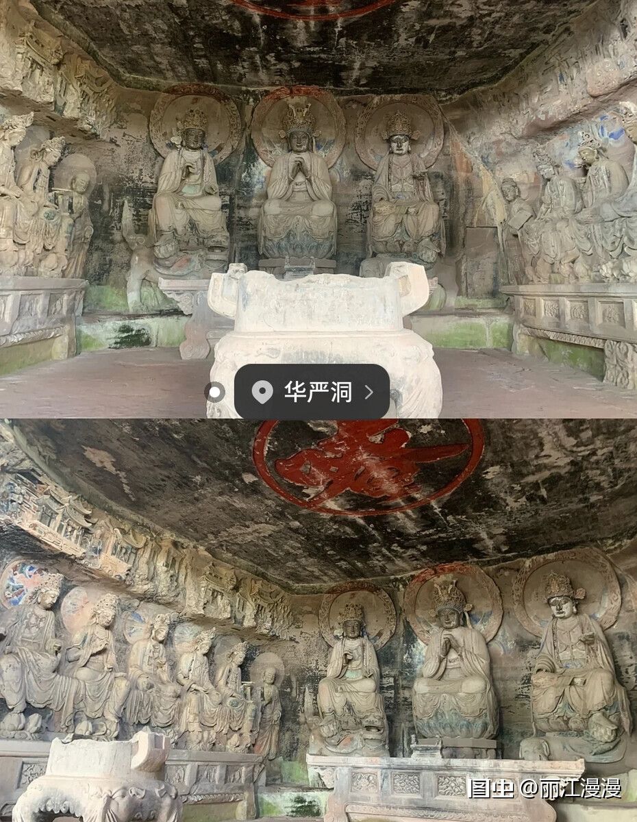 ?华严洞:是安岳众多石窟里单体面积最大的一座洞窟。华严洞开凿于北宋,主尊乃华严三圣,毗卢遮那佛居中,大智文殊菩萨和大行普贤菩萨分坐左右。在三圣的两侧,还有木犍莲、舍利佛二位弟子侍立。「#中华地理风光大赏」