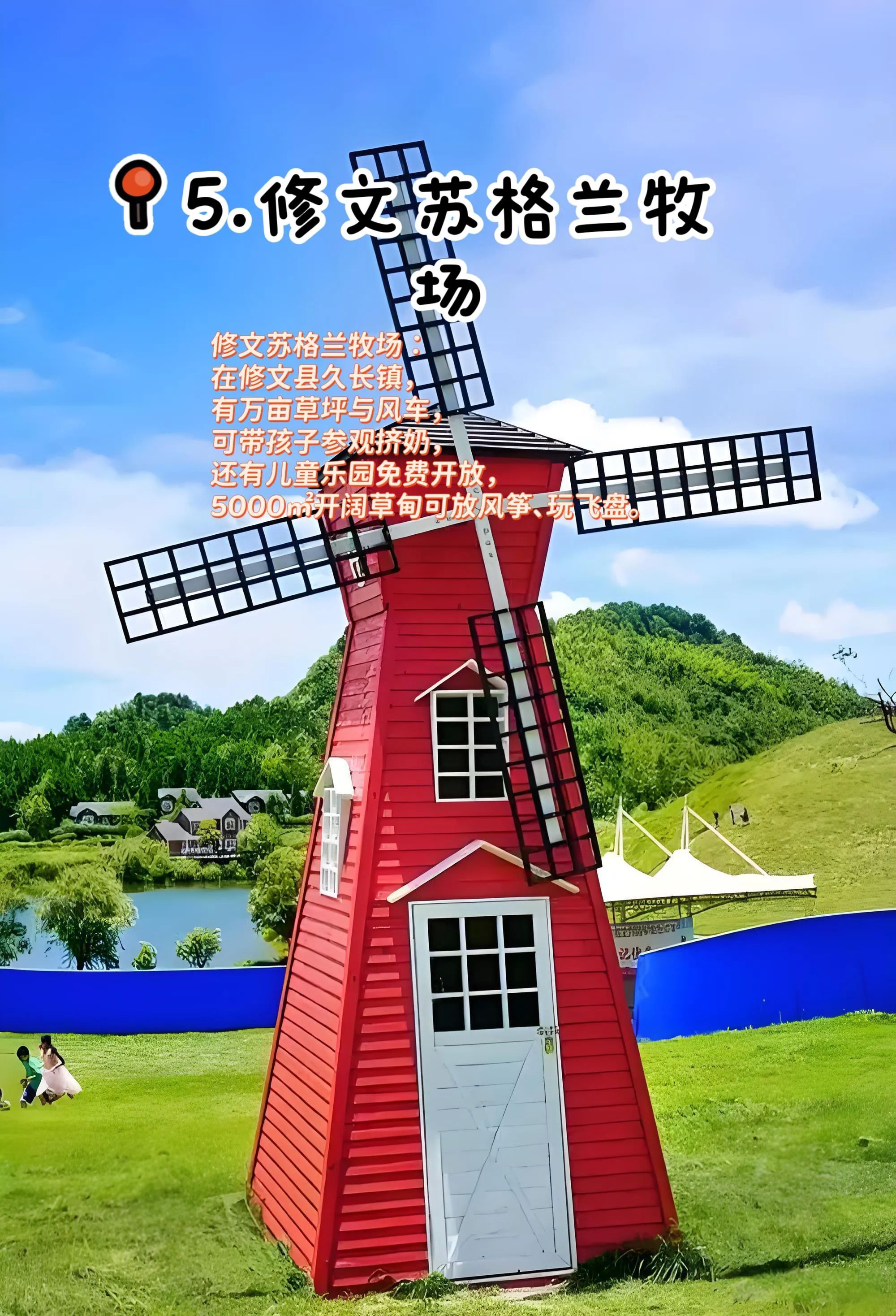 5. 修文苏格兰牧场:在修文县久长镇,有万亩草坪与风车。可带孩子参观挤奶过程,在“奶牛科普馆”了解牛奶生产流程,还能放风筝、玩飞盘 。