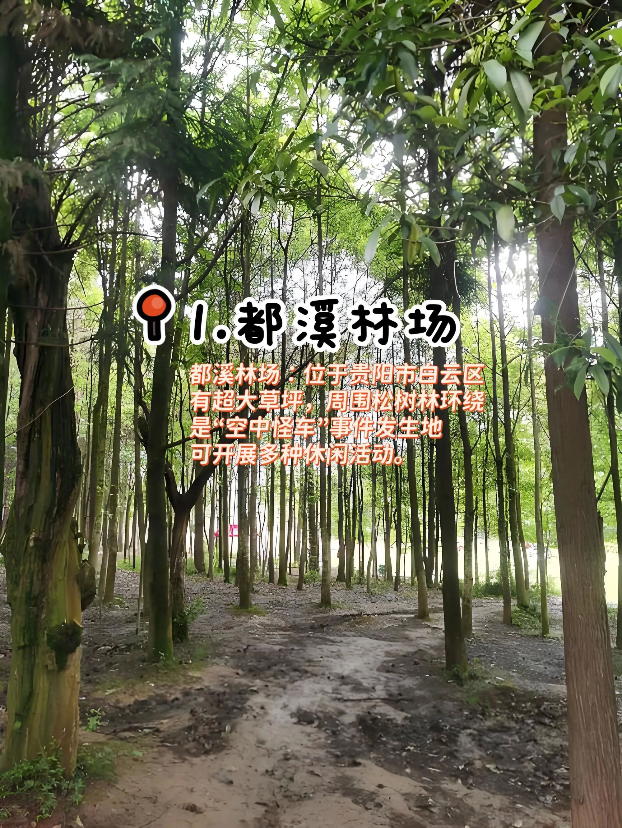 1. 都溪林场:位于白云区,因“空中怪车”事件闻名。这里有超大草坪,被松树林环绕,充满生机。可以在草坪上露营、放风筝、遛娃、遛狗,还能骑马、玩秋千吊床,非常惬意。此外,附近有废弃铁路,拍照很出片 。