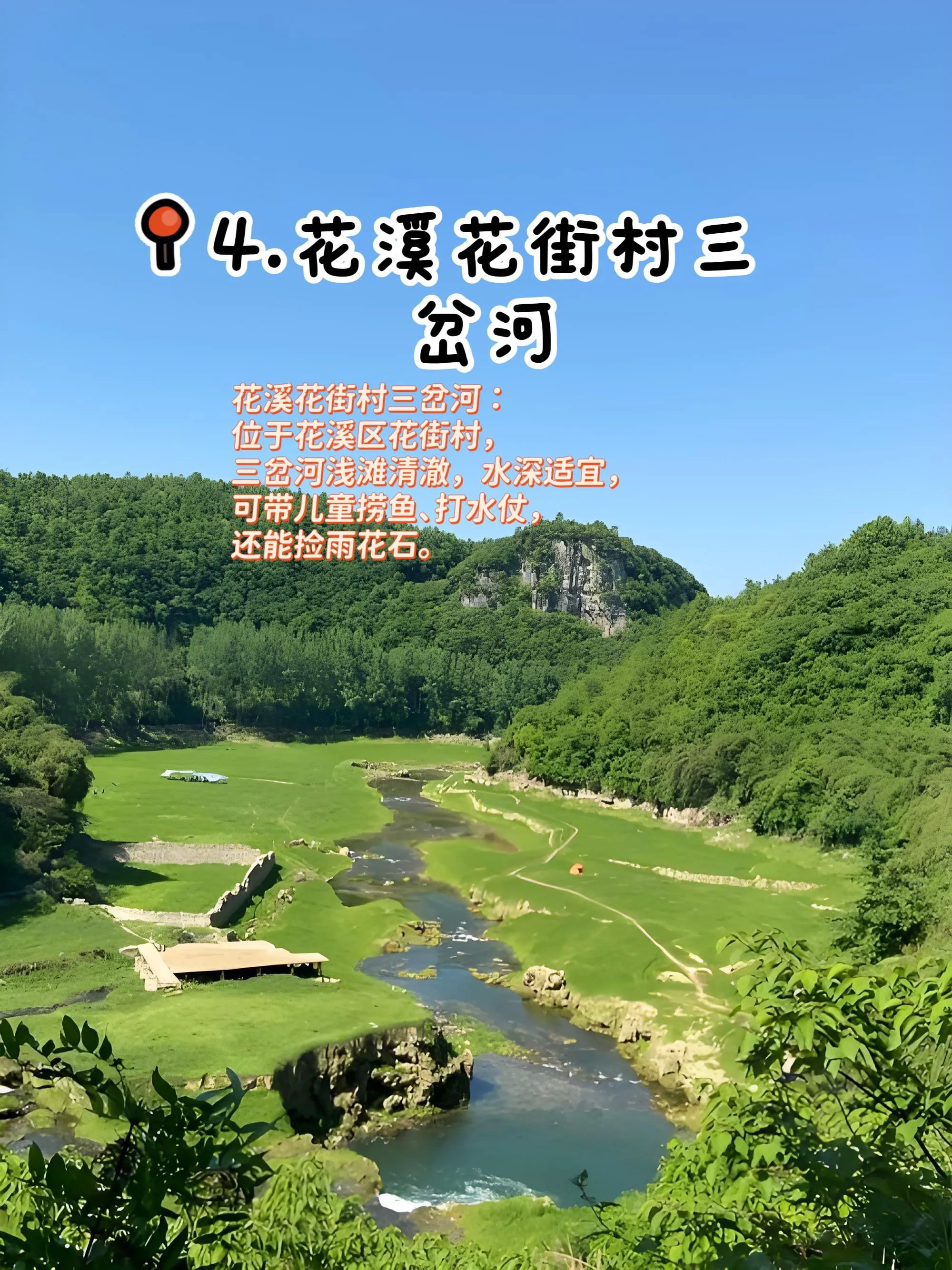 4. 花溪花街村三岔河:营地在花溪区花街村,三岔河浅滩清澈,可带儿童捞小鱼、打水仗,还能捡雨花石。家长能在树荫下用电烤炉烤肉,附近农家乐有现杀河鱼 。