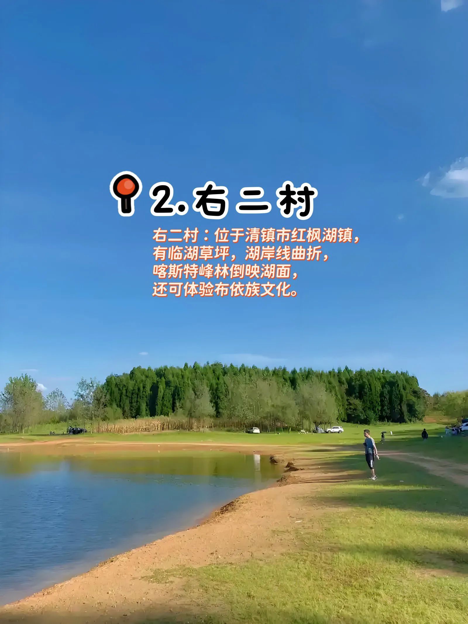 2. 右二村:地处清镇市红枫湖,靠近红枫湖的临湖草坪,能拍出以村庄为背景、绝美湖景为衬托的露营大片。这里安静宜人,可玩水、玩桨板,车子能开到湖边,运气好还能看到绝美月出 。