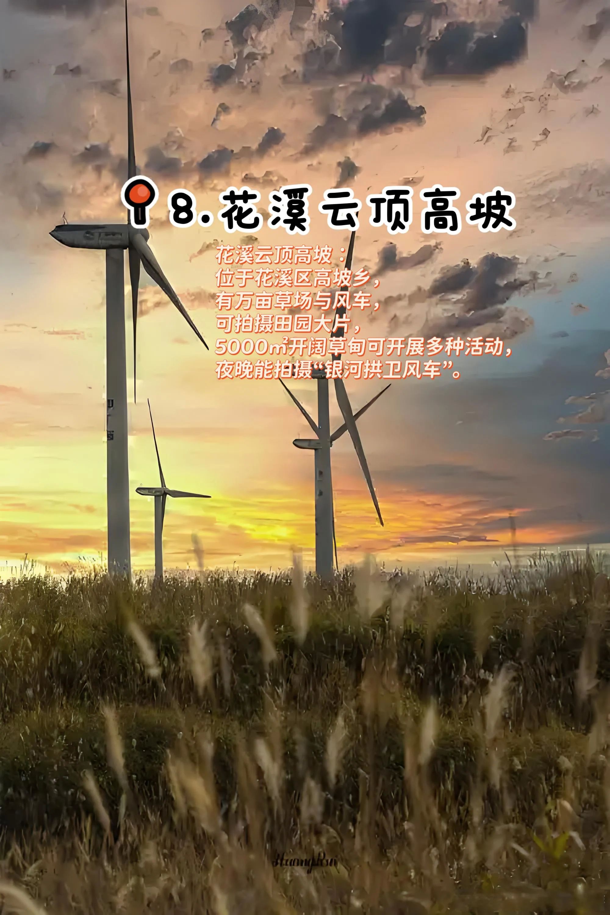8. 花溪云顶高坡:地处花溪区高坡乡,有万亩草场与风车,可拍摄“风吹草低见牛羊”的田园大片,5000㎡开阔草甸能放风筝、玩飞盘 。