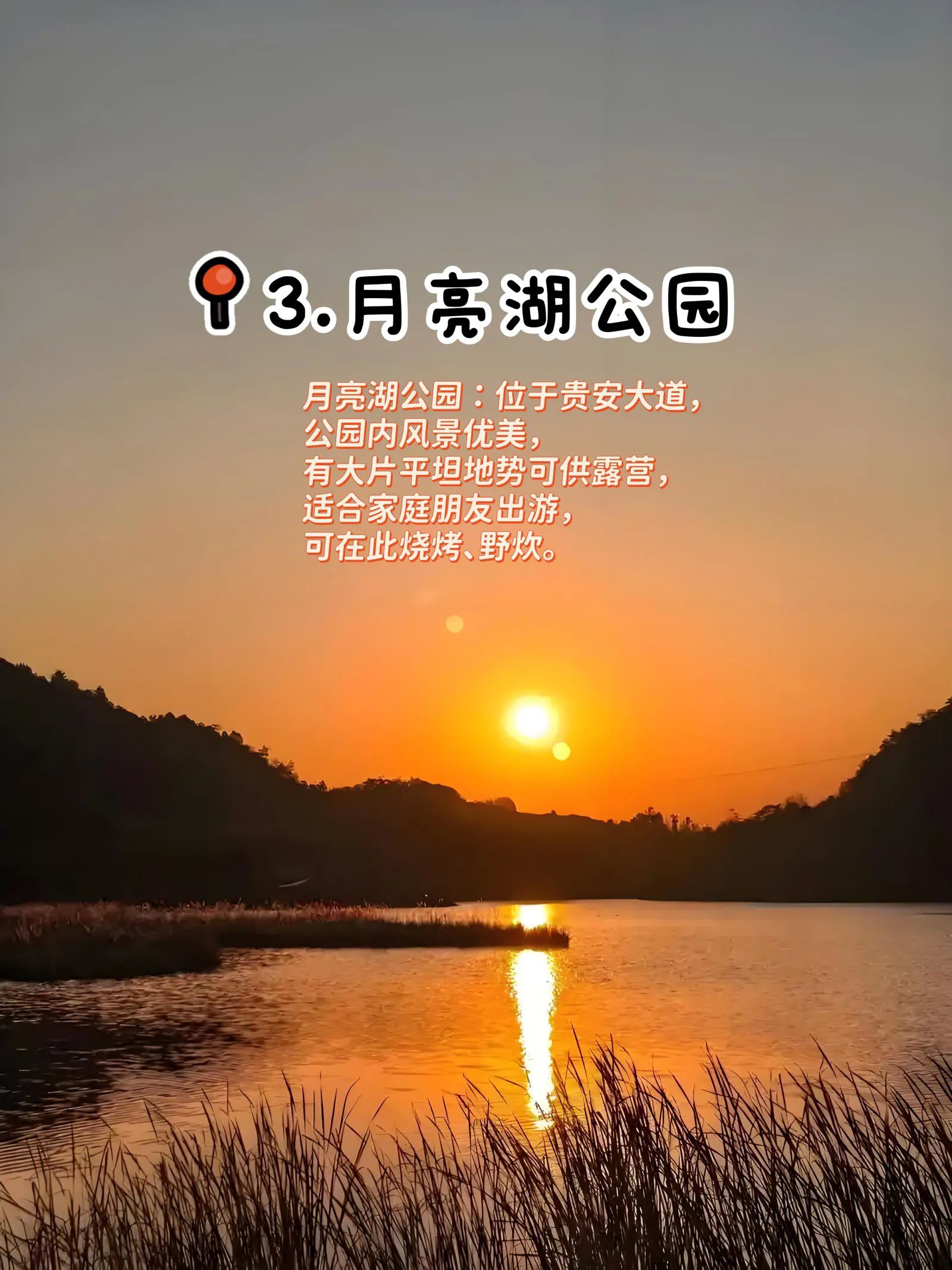3. 月亮湖公园:位于贵安大道,风景优美,有大片平坦地势。在这里可露营、烧烤(不能明火)、野炊,适合家庭朋友出游,还能欣赏绝美日落 。
