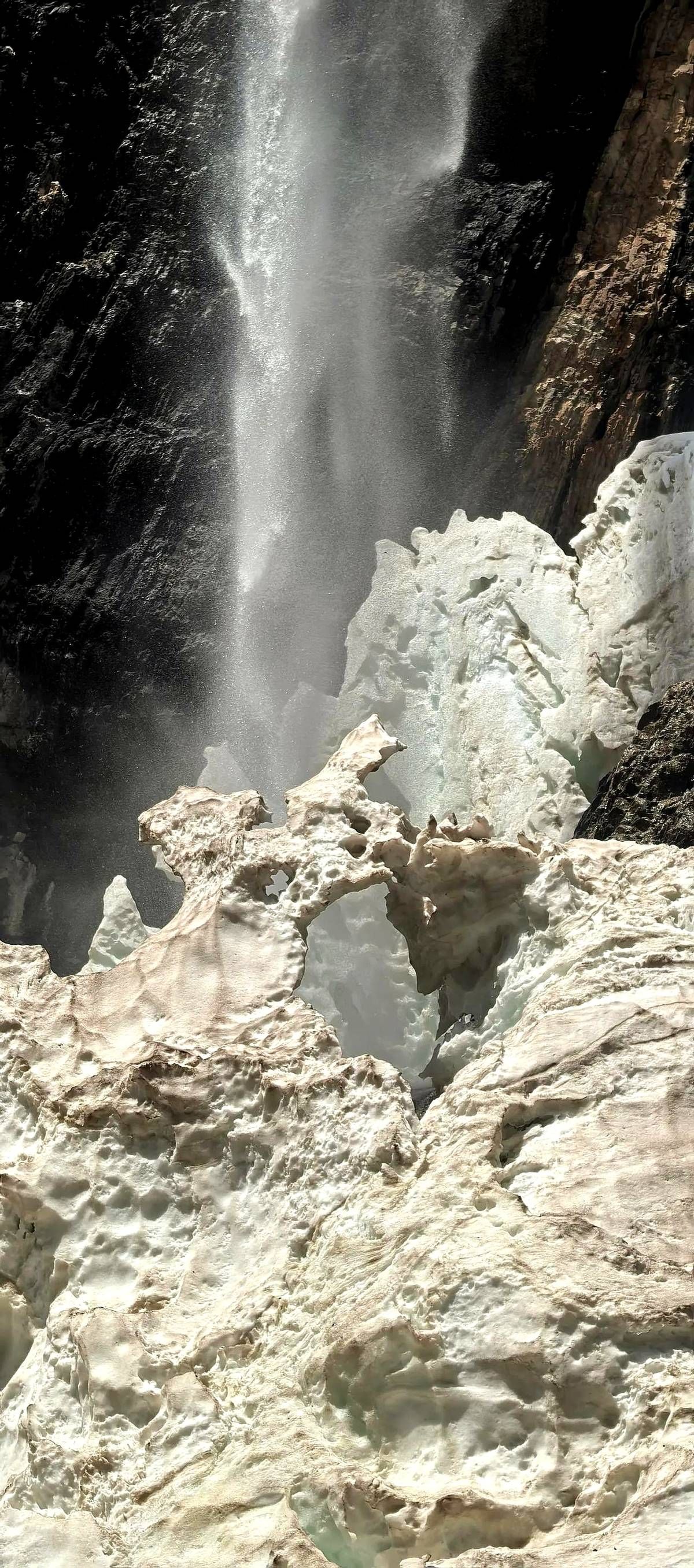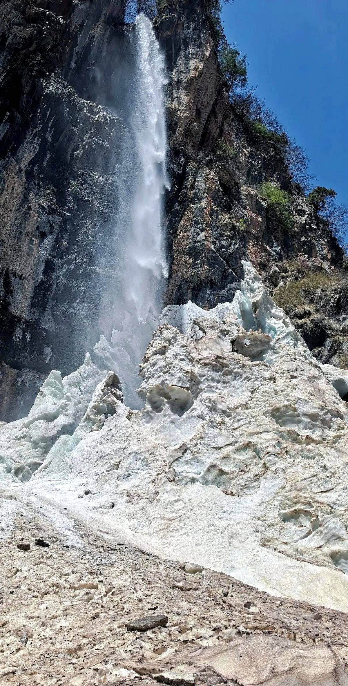 海拔2500米的官珠沟天瀑,水流从百米悬崖直坠而下,底部却铺展着厚达数米的冰层。