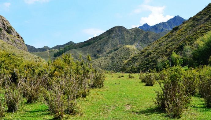 这里草原开阔,远方是绵延不绝的银色雪峰,每年的五六月,水草丰茂,草花争艳,周围峰峦迭嶂,满山苍松翠柏,一派郁郁葱葱。
