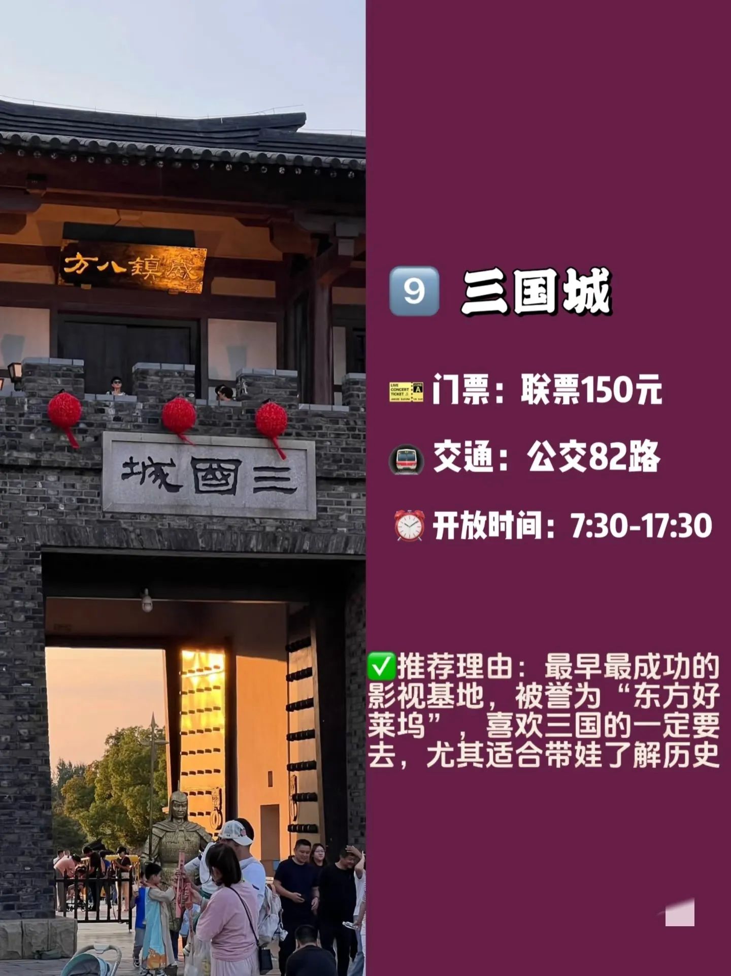 - 三国城:国内首个超大规模影视基地,当年《三国演义》的经典场景都在这里取景,沉浸式体验“东方好莱坞”的魅力。