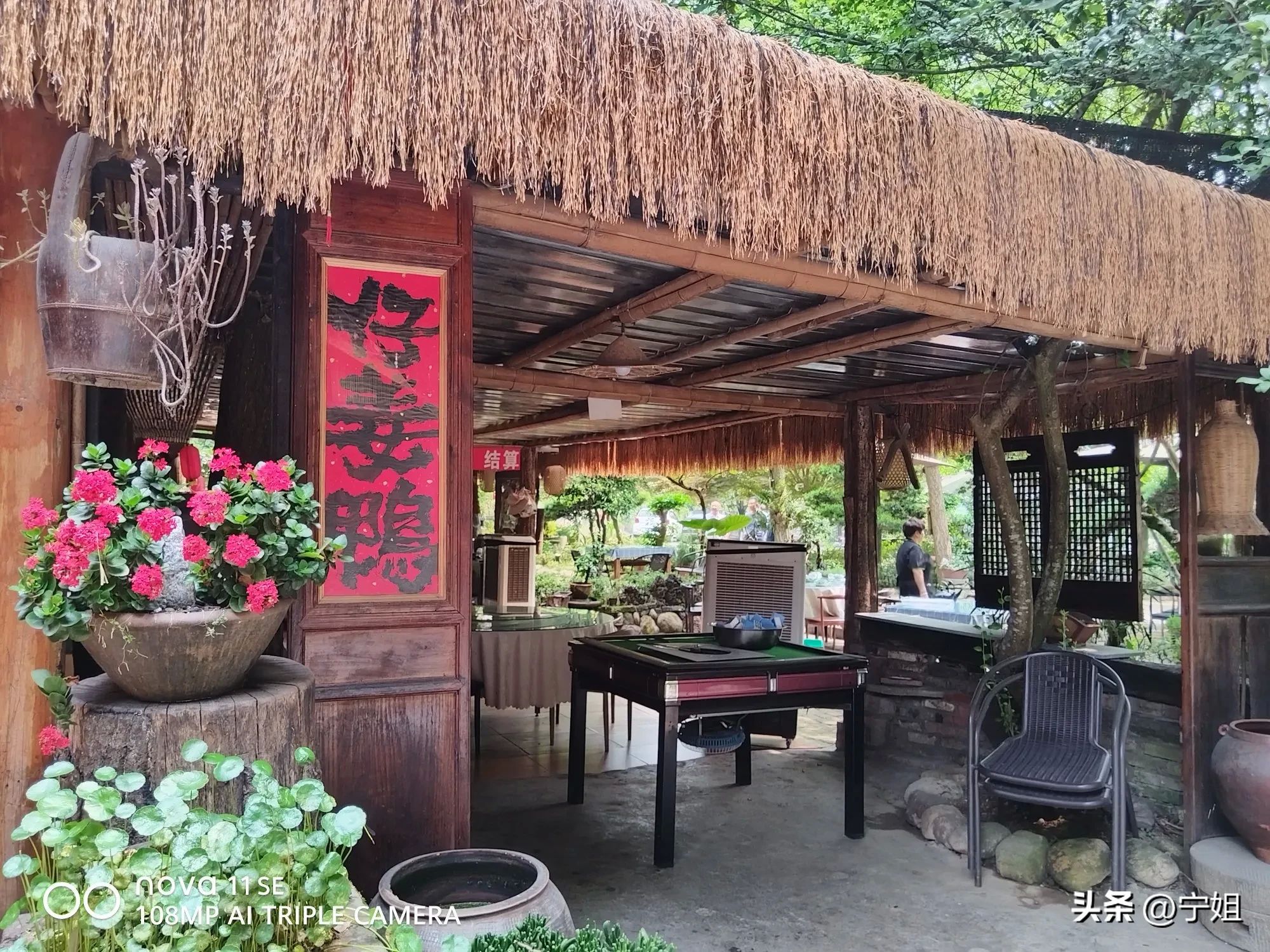 我们深入这农家院子,转了一大圈,知道了这是几子妹联合开发的农庄,布置挺别致,房前屋后挂着灯笼,大厅里挂着一排排草帽作装饰,也供随便取用,室外到处撑起大伞,伞下放置茶桌茶椅,随处可见:方的、长的、圆的,各种形状,挨树摆放,就坐品茗,十分合意。