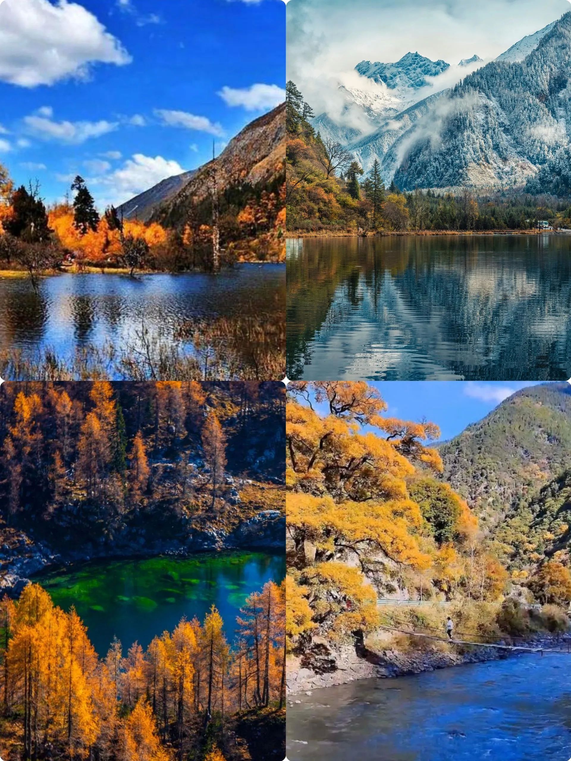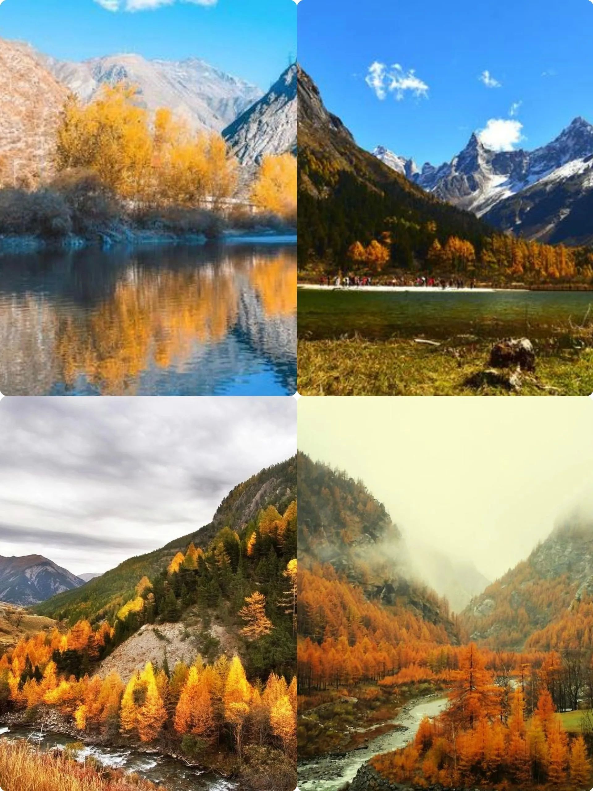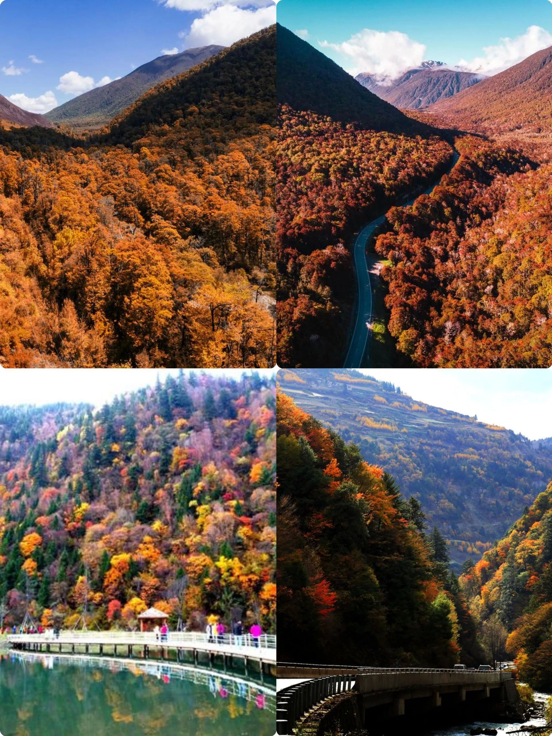 景区江河纵横,林海浩瀚,群山连绵,四季风光宜人,秋季平均气温在10℃左右,非常适合户外活动,霜降过后,沿杂谷脑河谷两岸密林中的枫树、械树、桦树、鹅掌松等渐第经霜,树叶被染成绚丽的色彩,如春花怒放,红涛泛波,金黄流丹,极有"霜叶红于二月花"的胜景,这里以金秋红叶、古尔沟温泉、雪山银峰、藏羌民族风情而出名,秋天宛如神奇的红色梦幻世界,成为旅游爱好者和摄影者的天堂