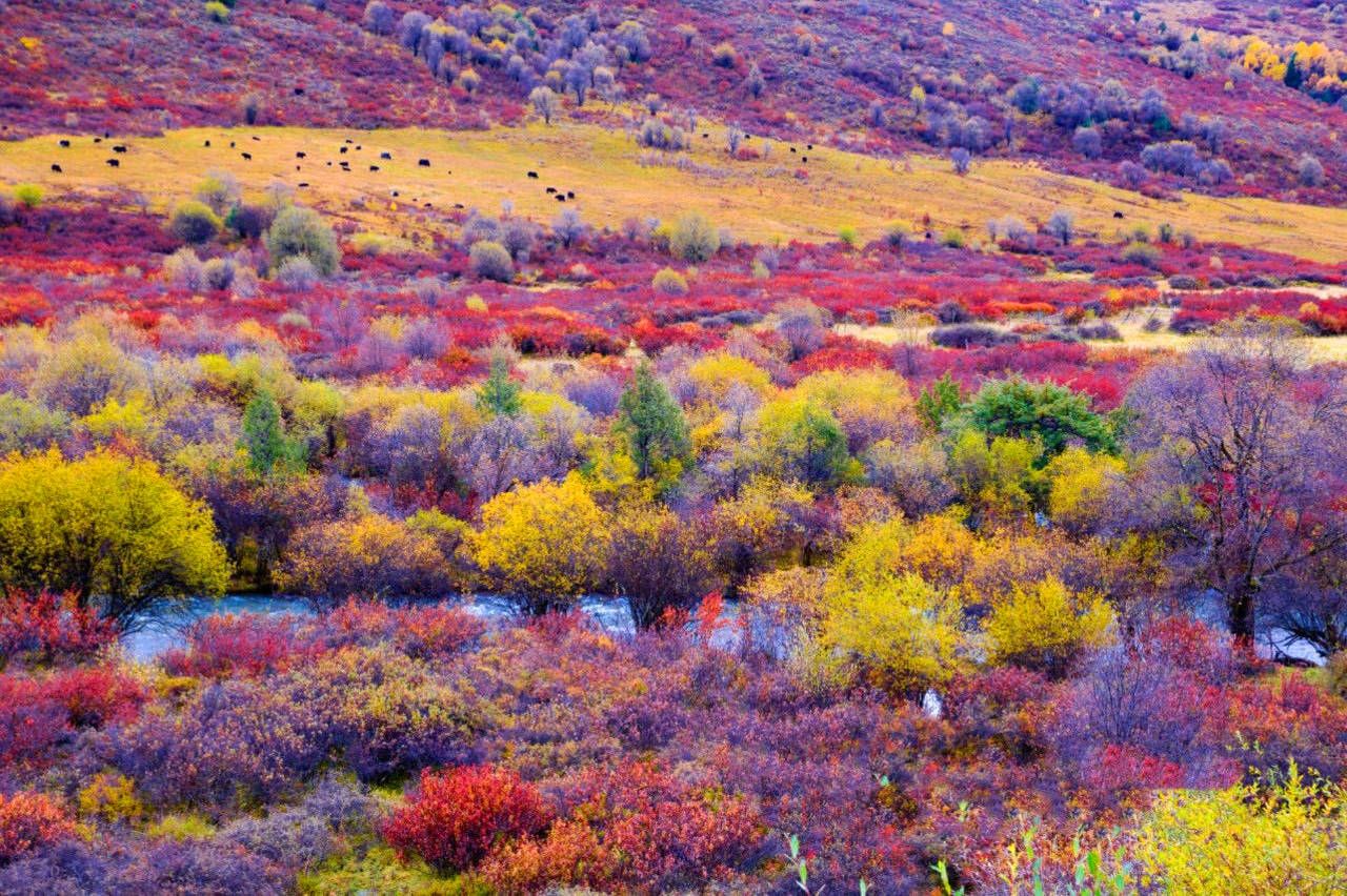 这里的红叶景区覆盖了3688平方公里,面积之大是北京香山红叶风景区的180余倍。"米亚罗"这个名字在藏语中意为"好耍的坝子",每年秋季,10月中旬至11月上旬,红叶从山顶至河谷层次分明地逐渐变红,形成了一片片火焰般的红色海洋,被誉为我国目前发现并开放的面积最大、景色最为壮观的红叶风景区。