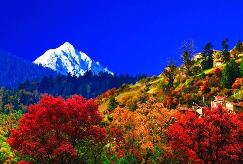 米亚罗的红叶,如春花般怒放,红涛泛波,金黄流丹,三千里红叶装饰着三千里江山,成为一大奇观。这里的金秋美景、神奇迷人的藏羌风情、清新宜人的古尔沟温泉、雄伟壮丽的雪山银峰,共同绘就了一幅瑰丽多彩的画卷。