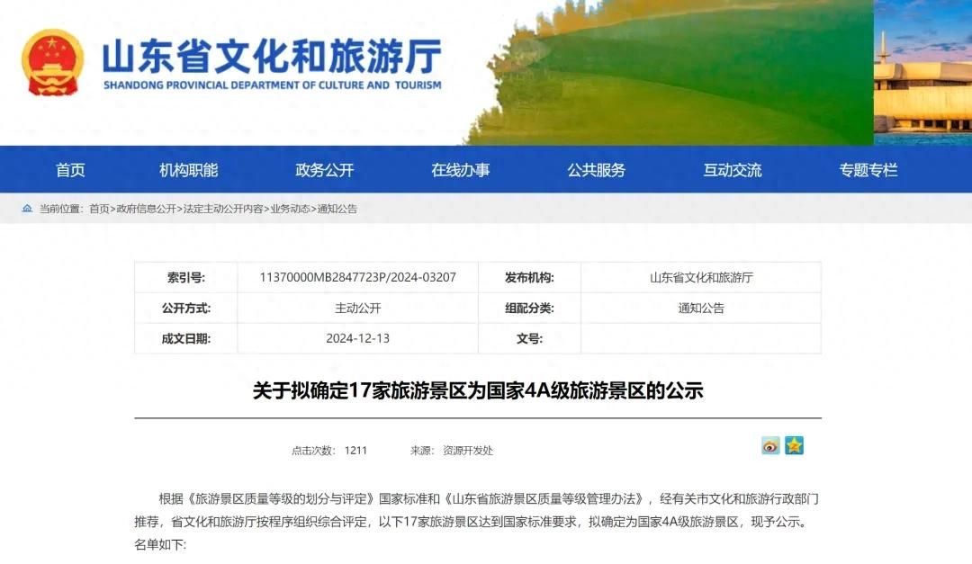 12月13日,山东省文化和旅游厅发布关于拟确定17家旅游景区为国家4A级旅游景区的公示: