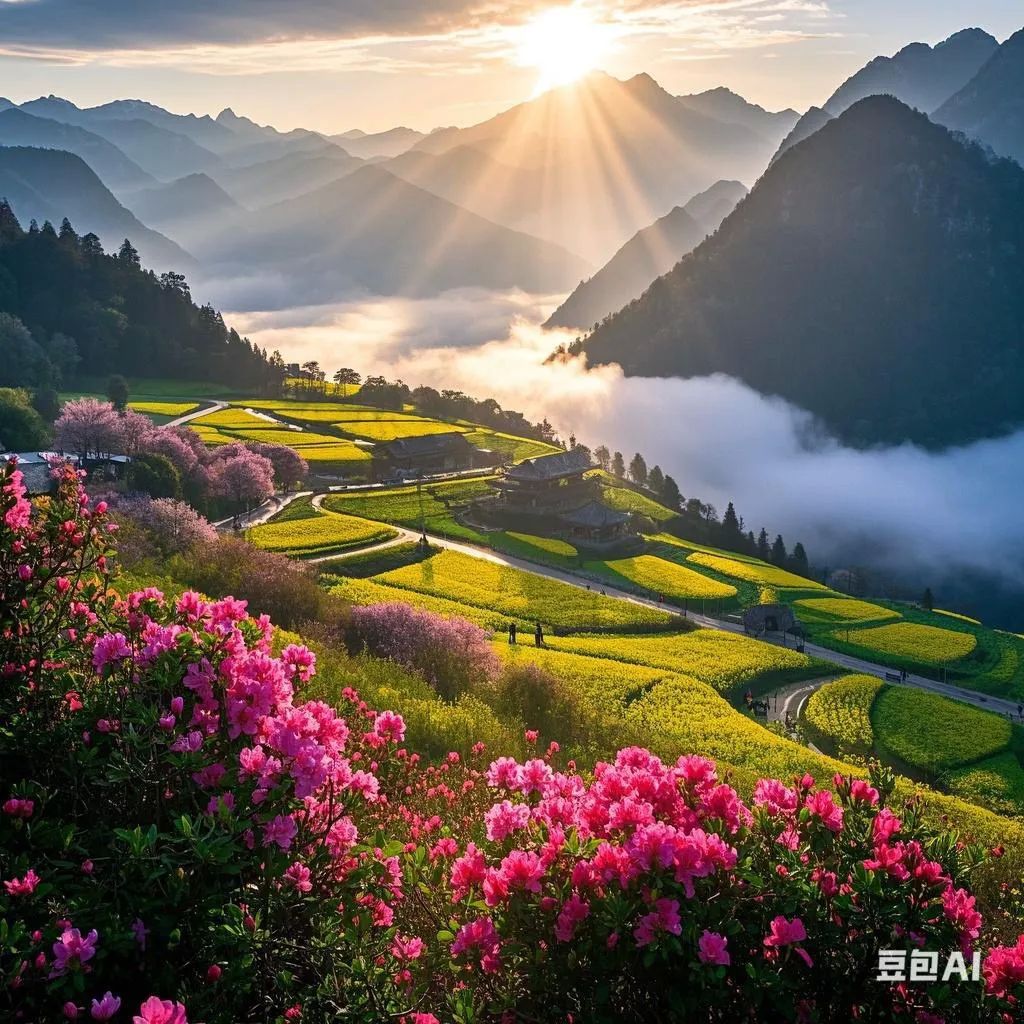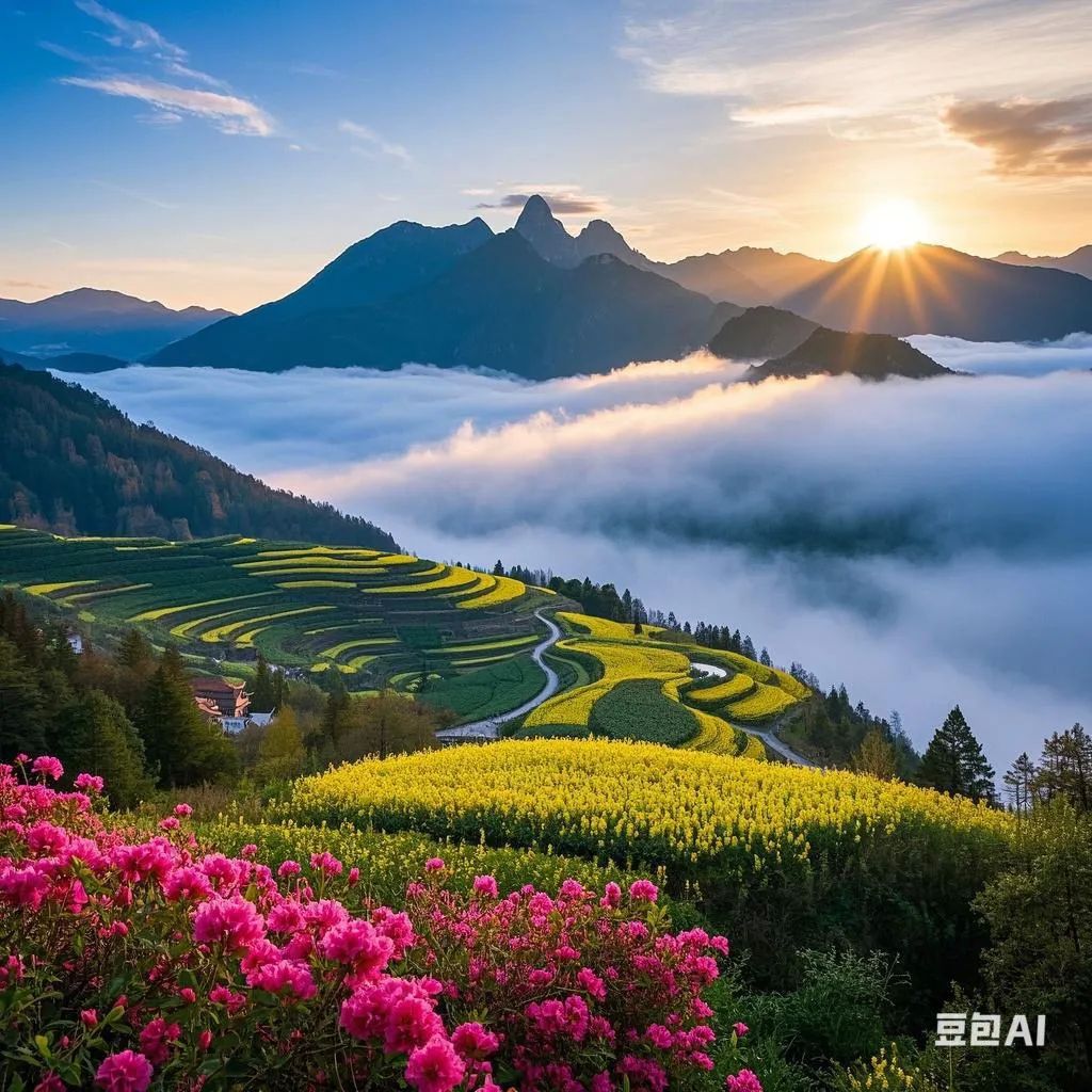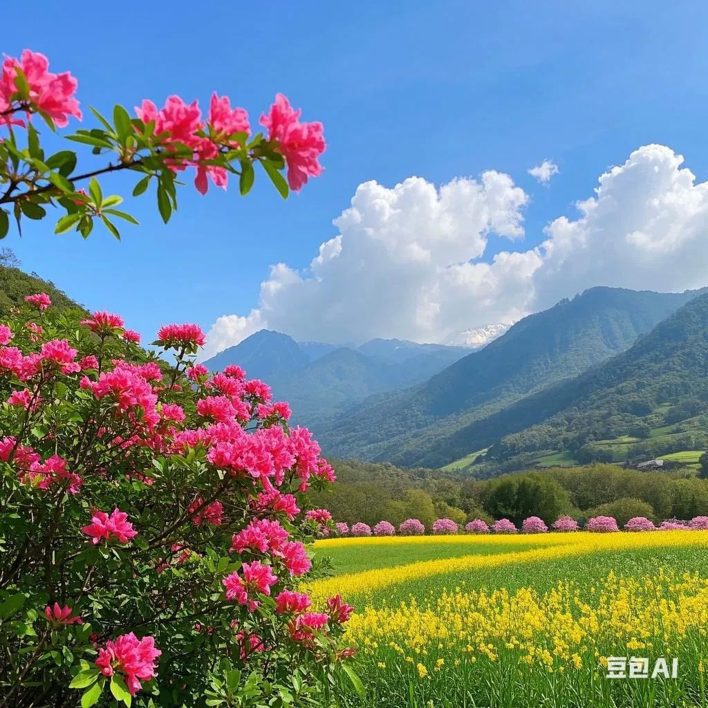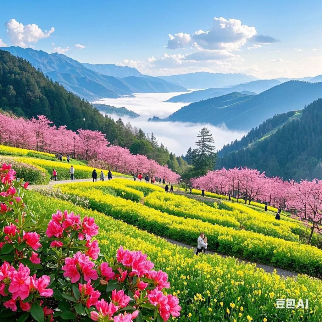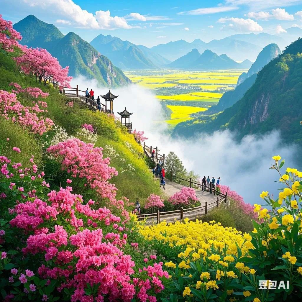 (文案可配图:九皇山云海杜鹃/千佛山樱花长廊/安县金色油菜花田全景)