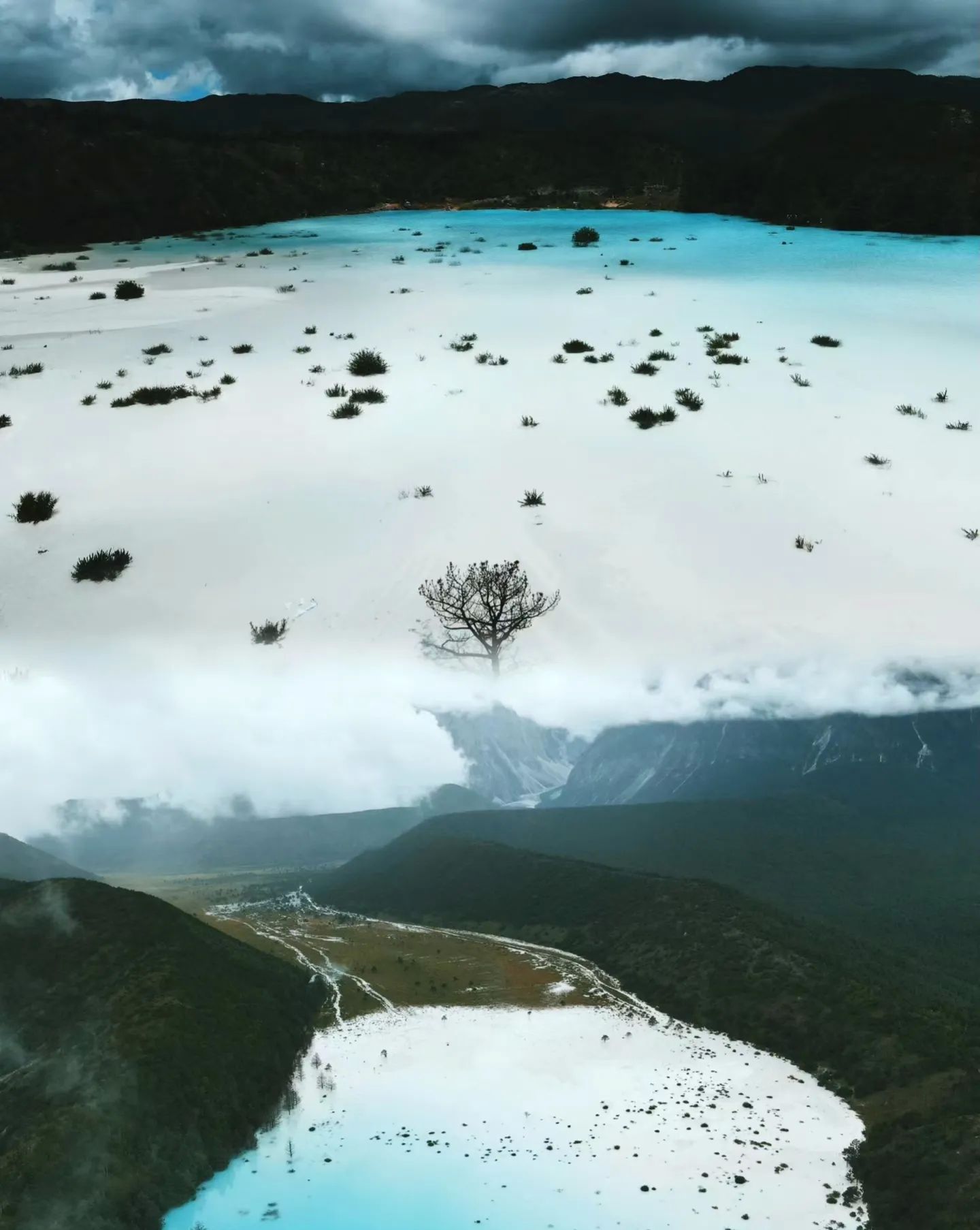 雪山积雪融化成水,裹挟着高原白色钙化物质奔流而下,在干河坝的洼地汇聚成淡蓝色的牛奶湖,形成一片梦幻的纯净之地