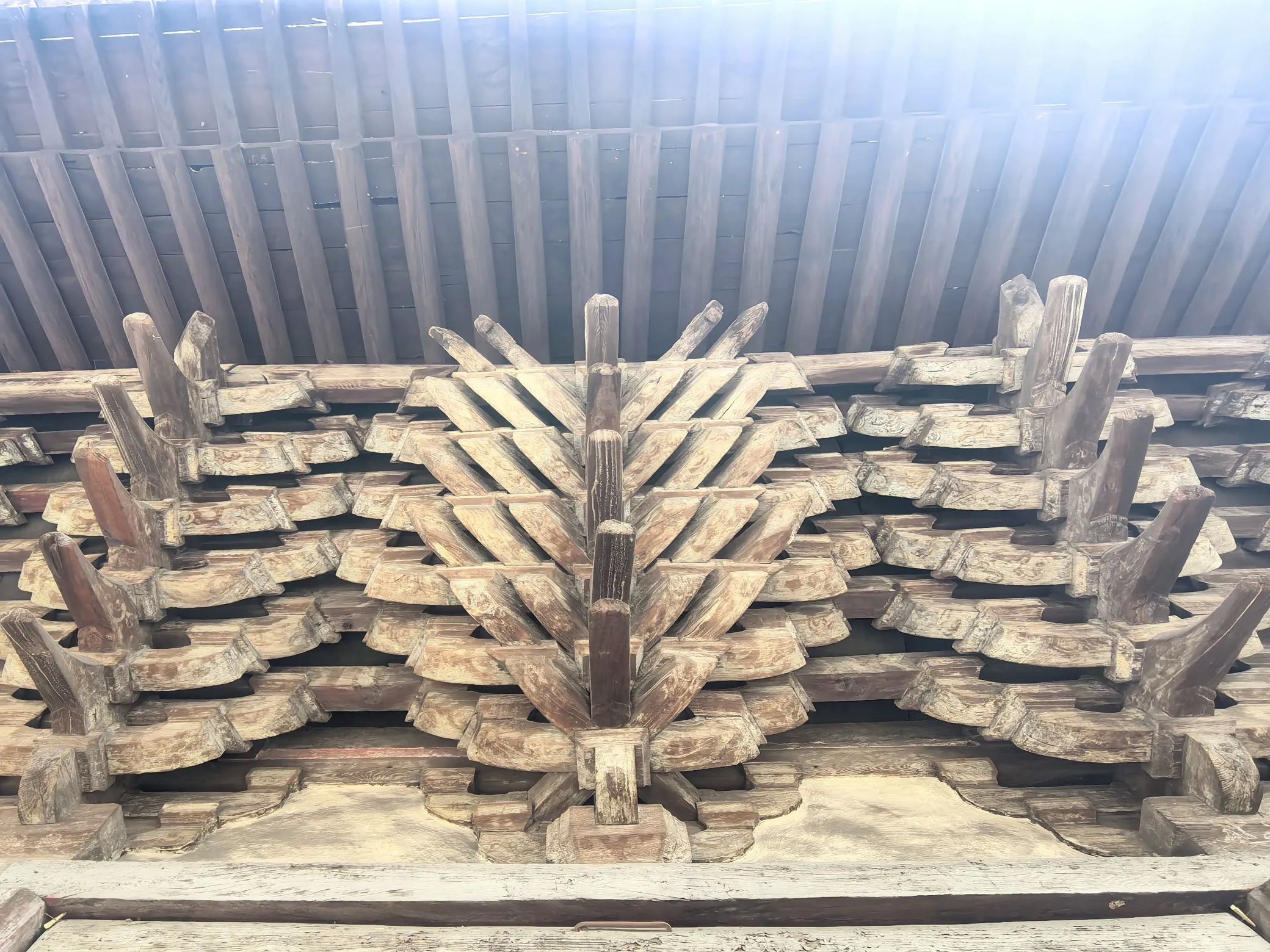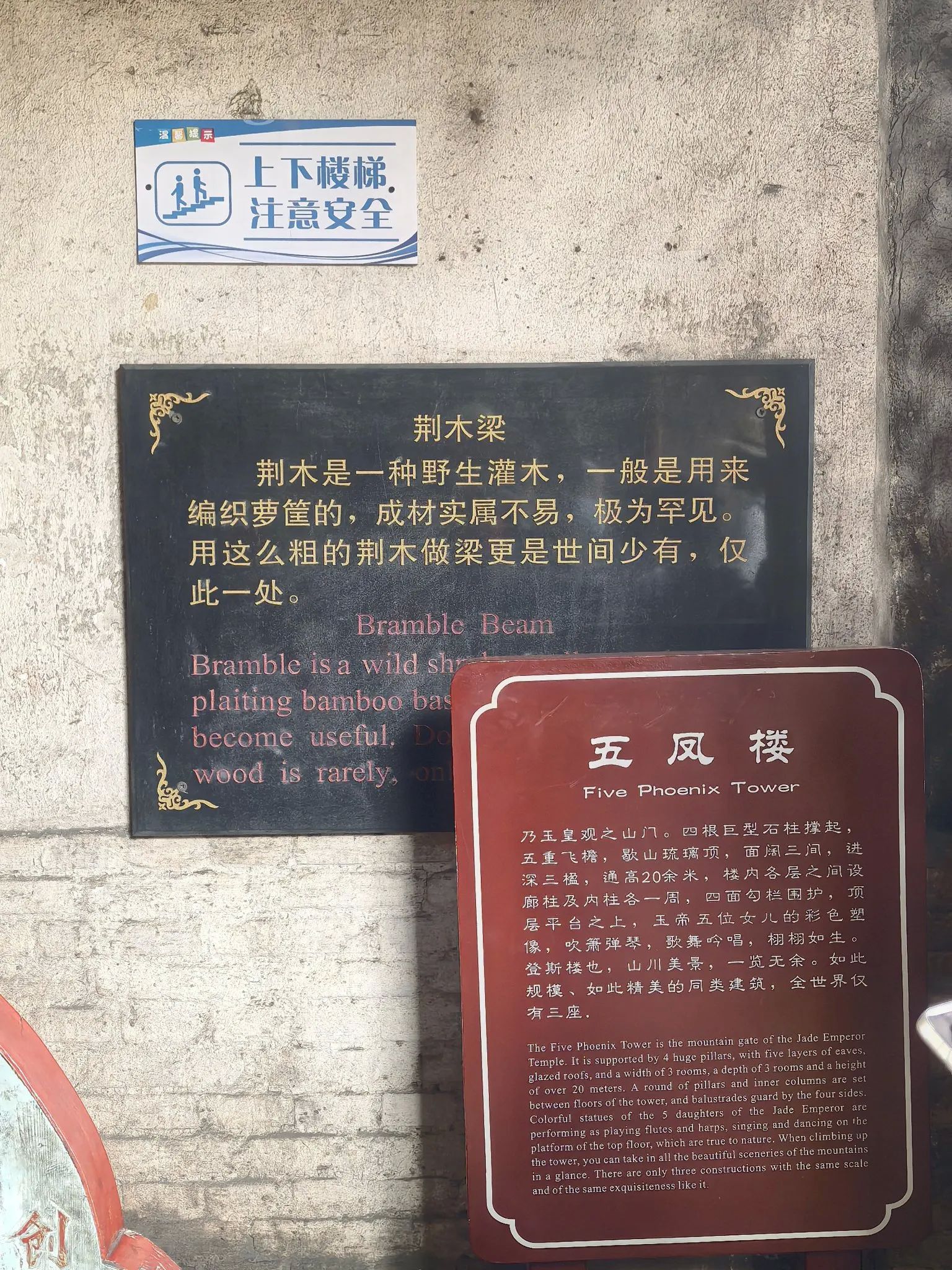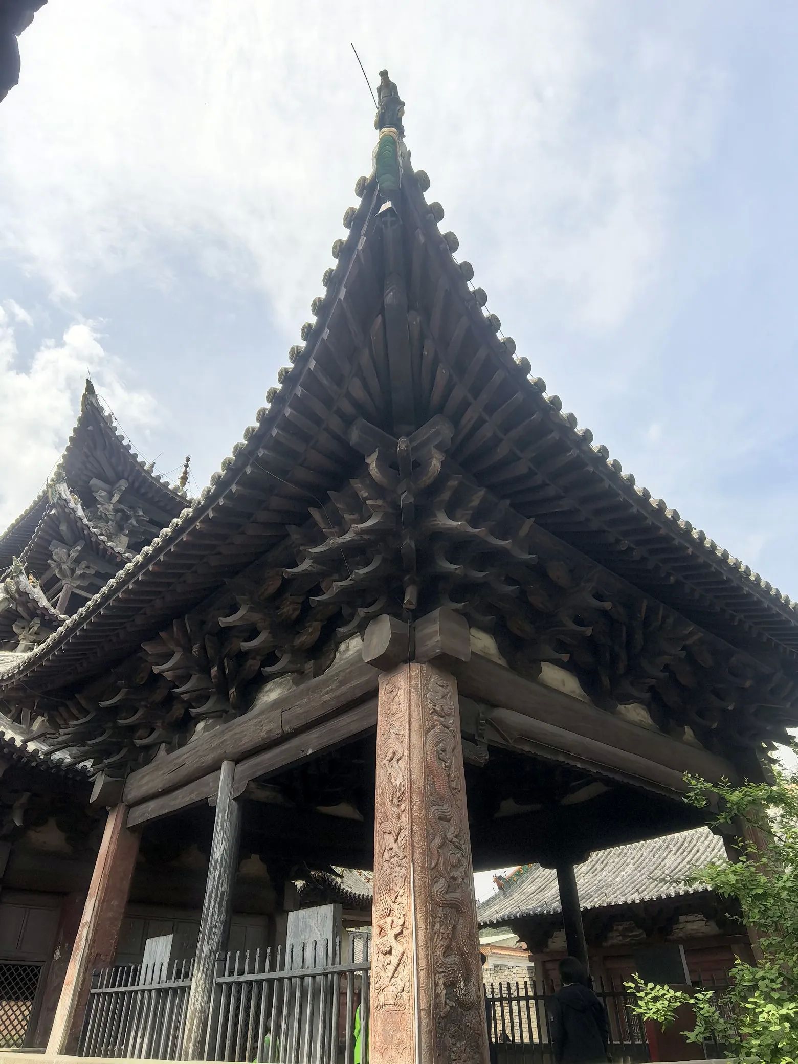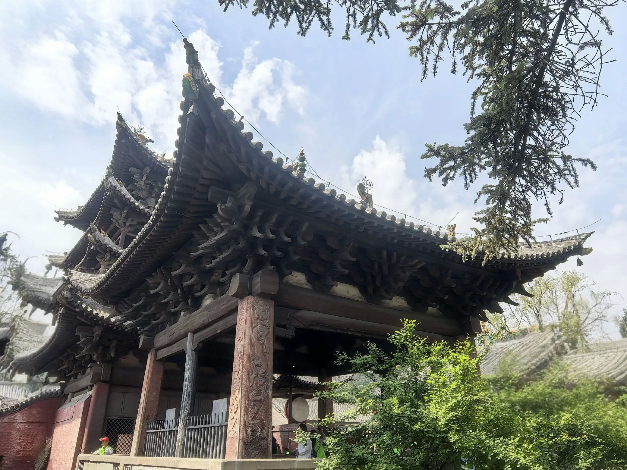 五凤楼五大奇观,一、桑木独梯有着500年的树龄,桑木独梯高7.13米。二、两根直径约50CM的彩绘大梁定会吸引你的目光,这便是五凤楼的第二大看点——荆木大梁。这两根大梁均由荆木制成,如此规格的荆木,生长需3000余年,其稀有性和珍贵性不言而喻。在漫长的岁月里,俗话说,“荆棘丛生难成材”,在五凤楼给于更正其俗说!三、藻井采用斗拱迭涩、垂莲吊挂的工艺,木制构件精致入微。仰头望去,藻井的每一处细节都彰显着古人的高超技艺。四、献亭“断梁”,这座精美的献亭,竟然仅用一根断梁支撑着屋顶。几百年来,无论是狂风暴雨,还是岁月的变迁,它都安然无恙。这根断梁,在建筑专家的眼中,至今仍是一个未解之谜。五、灵霄宝殿的前檐下的“七拱十三踩”斗拱,北京故宫的斗拱才九踩,五凤楼的第五大奇观。这种极为罕见的斗拱设计,即使是在建筑资源丰富的帝都,也难得一见。七拱十三踩的斗拱,层层叠加,造型复杂而有序,每一个斗拱都仿佛是一件精美的艺术品。