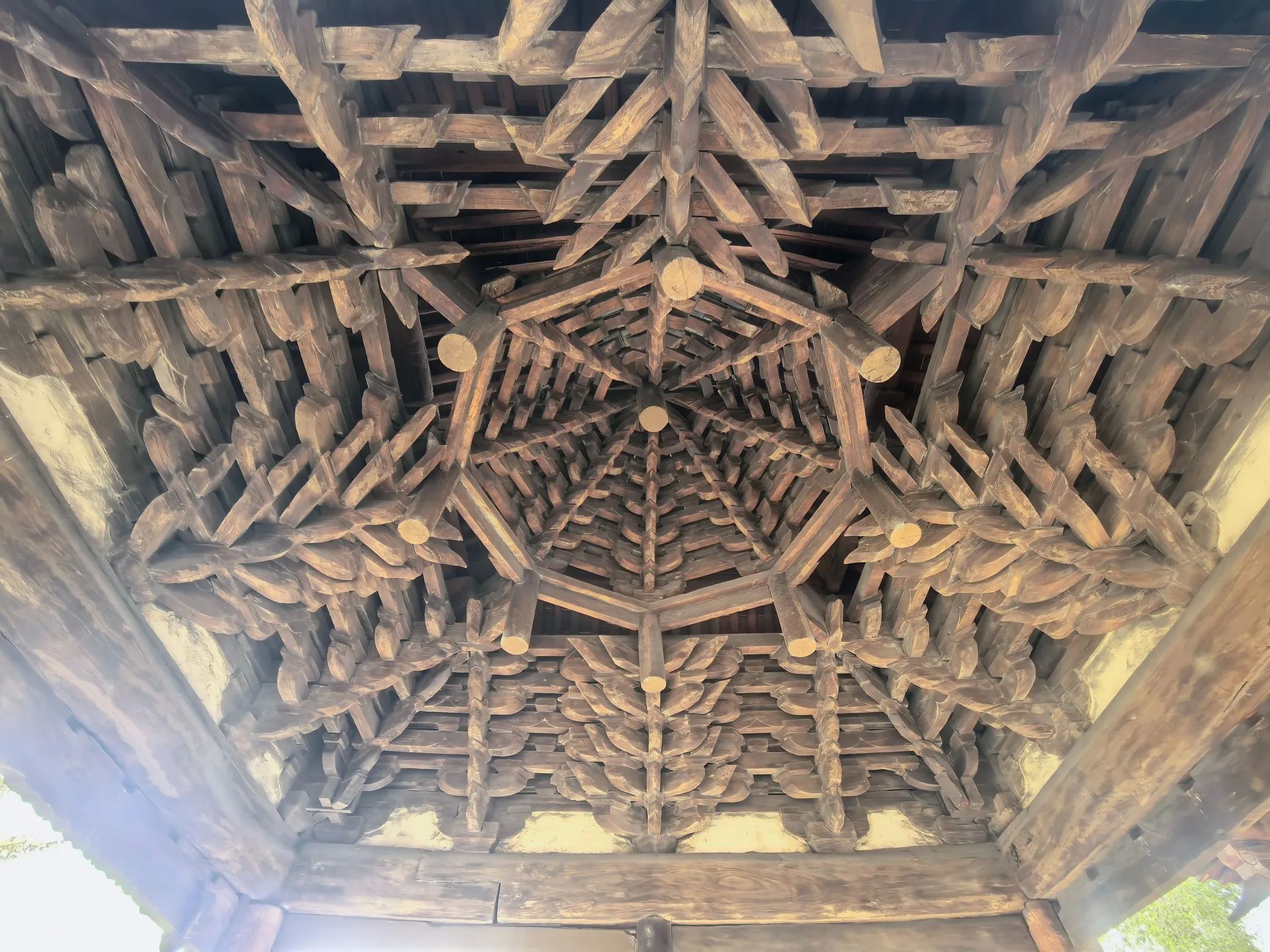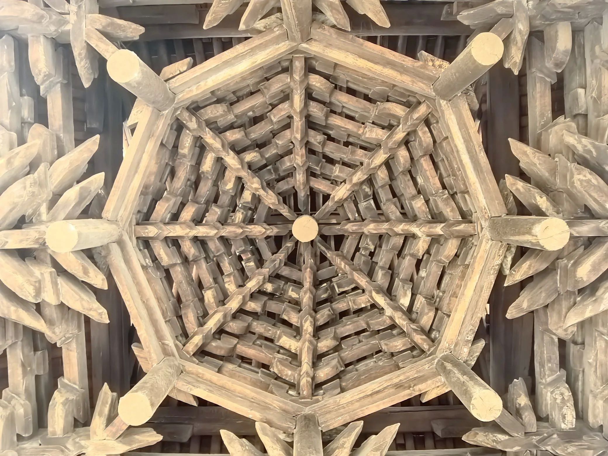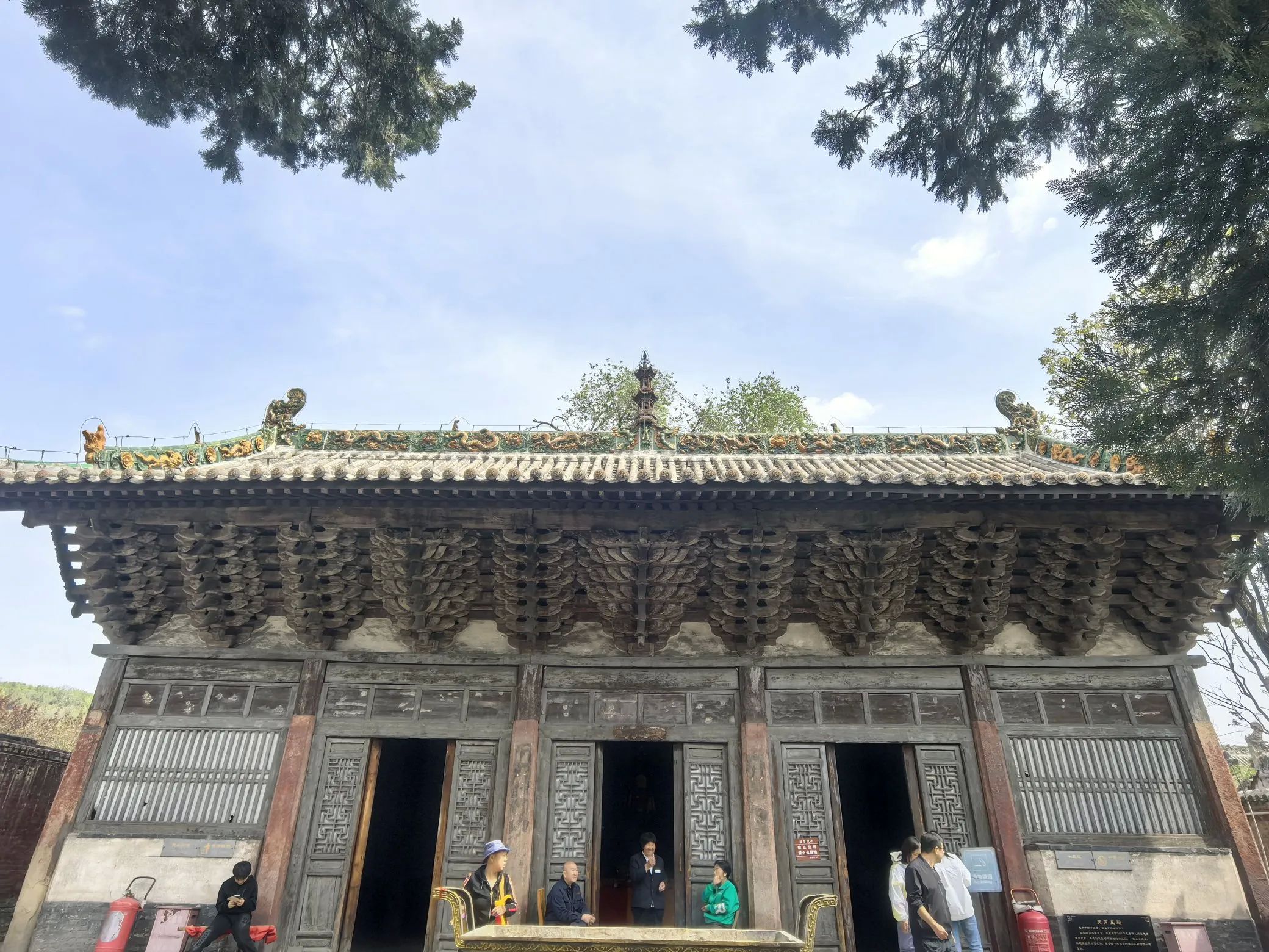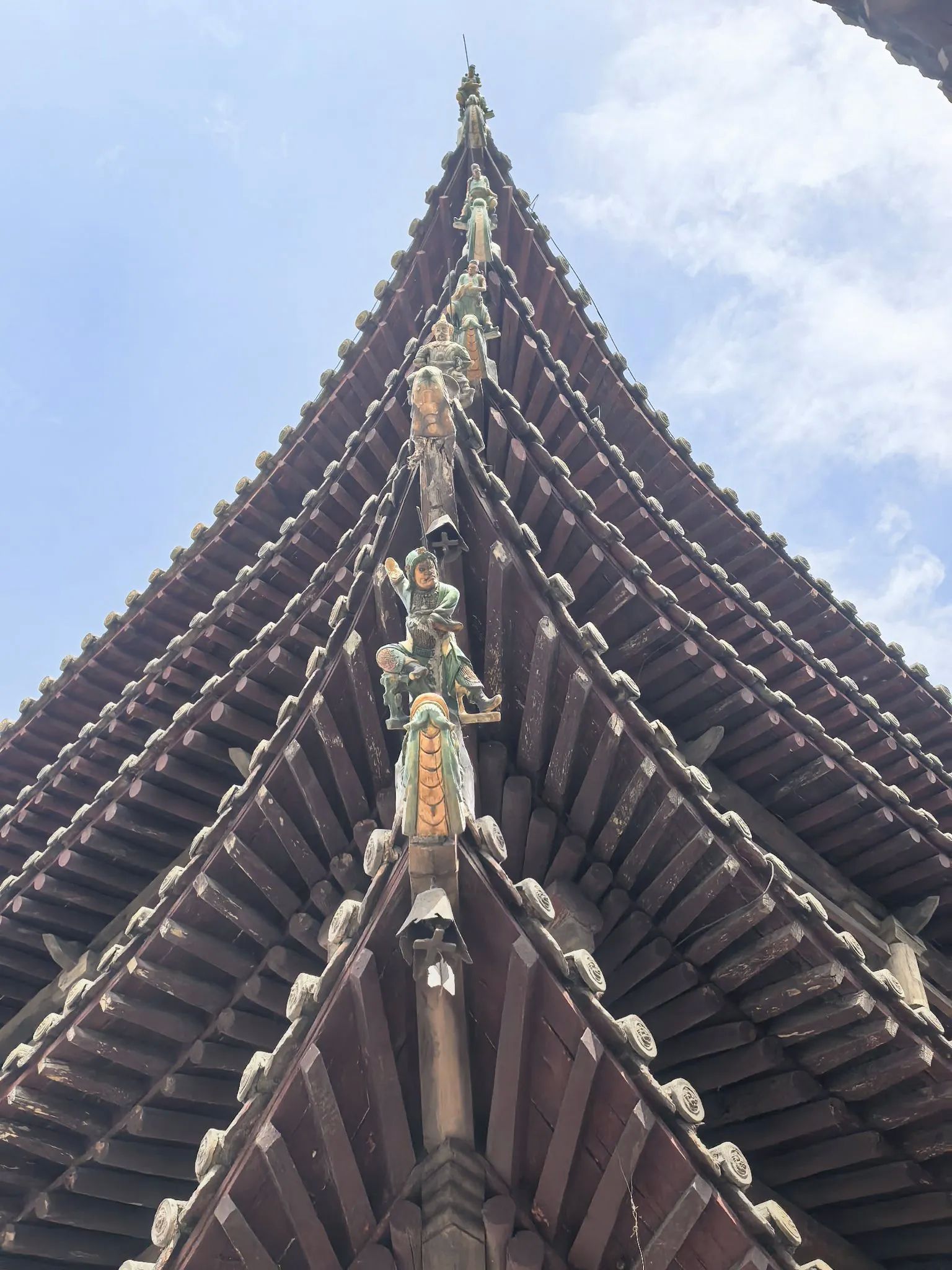 五凤楼五大奇观,一、桑木独梯有着500年的树龄,桑木独梯高7.13米。二、两根直径约50CM的彩绘大梁定会吸引你的目光,这便是五凤楼的第二大看点——荆木大梁。这两根大梁均由荆木制成,如此规格的荆木,生长需3000余年,其稀有性和珍贵性不言而喻。在漫长的岁月里,俗话说,“荆棘丛生难成材”,在五凤楼给于更正其俗说!三、藻井采用斗拱迭涩、垂莲吊挂的工艺,木制构件精致入微。仰头望去,藻井的每一处细节都彰显着古人的高超技艺。四、献亭“断梁”,这座精美的献亭,竟然仅用一根断梁支撑着屋顶。几百年来,无论是狂风暴雨,还是岁月的变迁,它都安然无恙。这根断梁,在建筑专家的眼中,至今仍是一个未解之谜。五、灵霄宝殿的前檐下的“七拱十三踩”斗拱,北京故宫的斗拱才九踩,五凤楼的第五大奇观。这种极为罕见的斗拱设计,即使是在建筑资源丰富的帝都,也难得一见。七拱十三踩的斗拱,层层叠加,造型复杂而有序,每一个斗拱都仿佛是一件精美的艺术品。