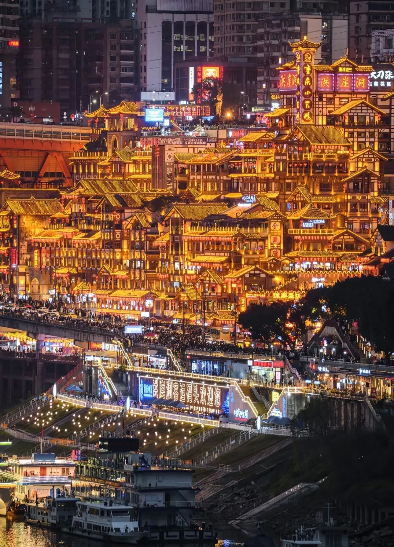 夜景封神:19:30-21:00亮灯后,吊脚楼群像金色城堡,在千厮门大桥上拍全景,江面上的游船灯光倒影,像走进宫崎骏的动画;