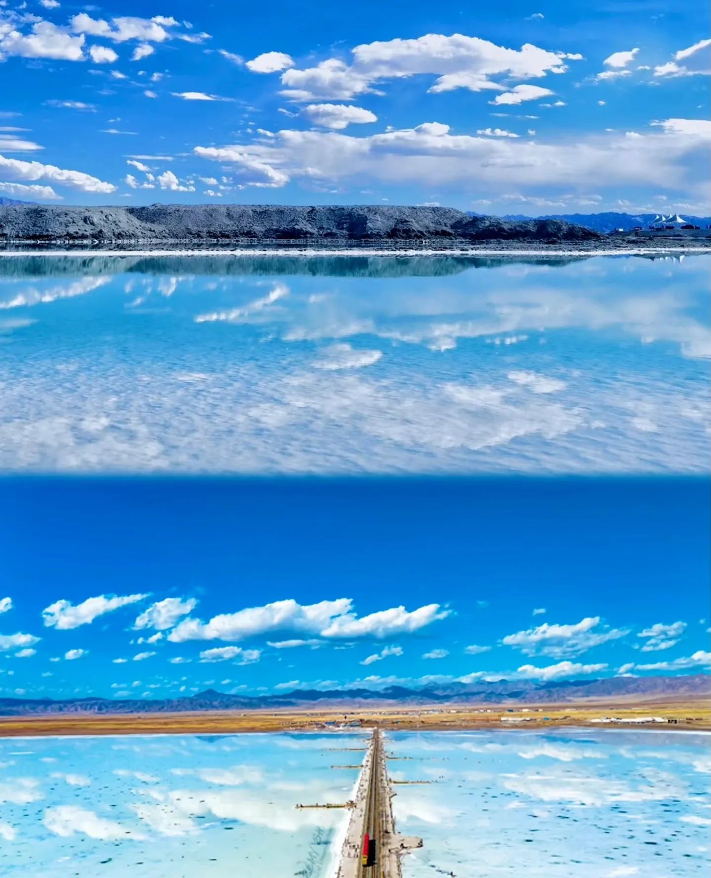 沉浸式体验:乘小火车到盐湖深处,赤脚走进浅水区,云朵倒影在脚下,抬手就能“抓住”天空;