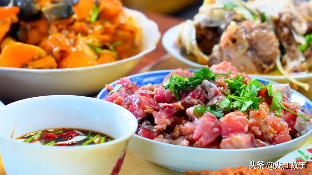 赫哲族以渔猎为生,三江流域盛产的“三花五罗”为其饮食提供了特色食材,独特的自然条件及生产生活方式也造就了赫哲族独特的饮食文化。无鱼不成宴,一鱼多吃,不单单是鱼肉,鱼筋、鱼骨、鱼鳞、鱼皮,生吃、炖吃、炒吃、烤吃,你能想到的各种吃法,都会出现在赫哲人的全鱼宴上。