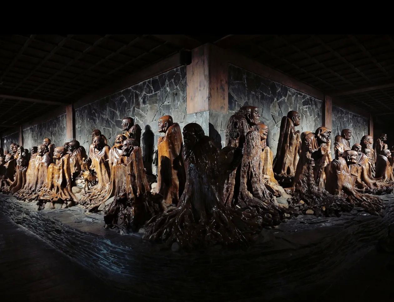 2、五百罗汉阵,长达数百米的五百罗汉阵,非常震撼,是一大亮点。五百尊根雕罗汉各具神态,生动逼真。