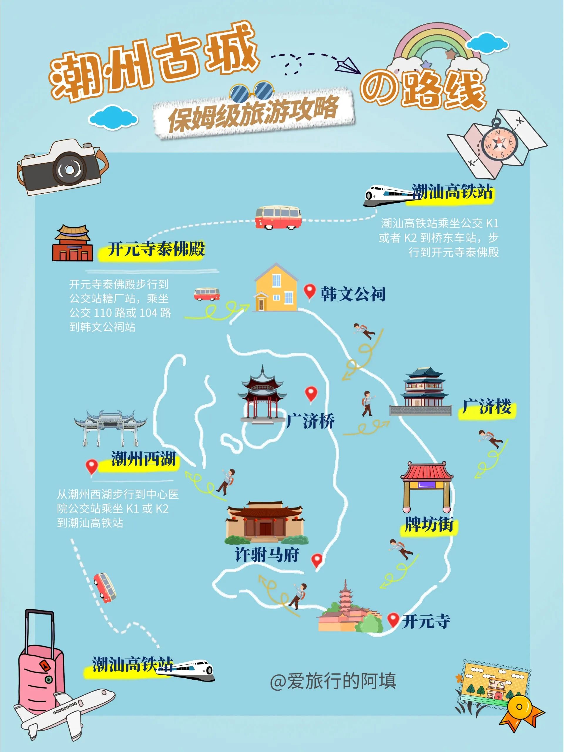 抵达潮汕高铁站后,可搭乘公交K1或K2前往桥东车站,随后步行便能到达开元寺泰佛殿。从开元寺泰佛殿出发,步行至公交站糖厂站,乘坐110路或104路公交前往韩文公祠。参观完韩文公祠,继续乘坐110路或104路公交到韩山师范(西区)公交站,步行即可抵达广济桥东门售票处。游览完广济桥,从东门步行过桥,对面就是广济门城楼。行程末段,从潮州西湖步行至中心医院公交站,乘坐K1或K2公交便能回到潮汕高铁站。