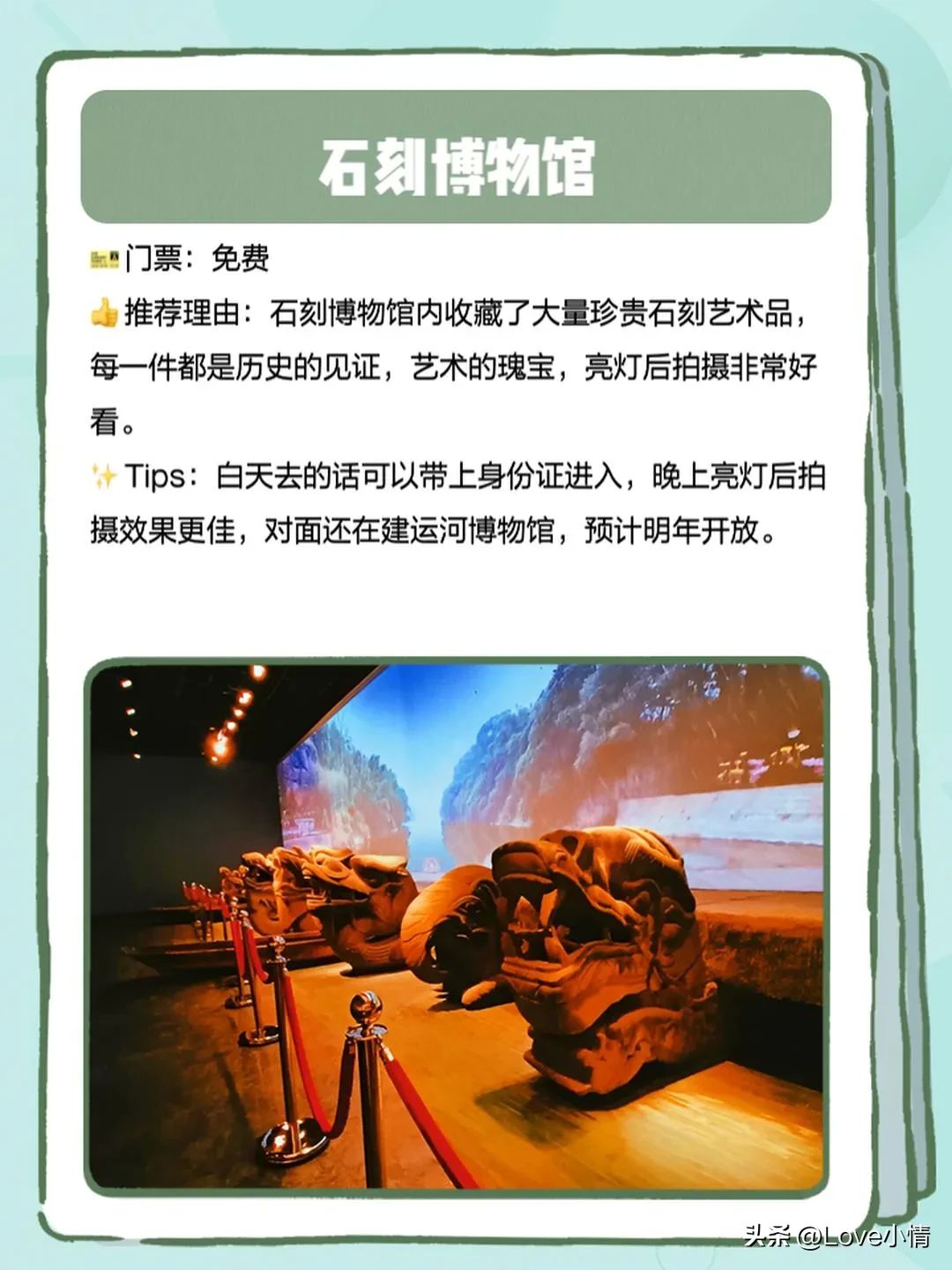 出片指南:踏入馆内,汉代画像石上的古老故事、明清碑刻里的书法神韵,每一件展品都像会说话。强推大殿门口的光影大片位,还有气势磅礴的大型沙盘,随手一拍都是历史氛围感拉满的大片!