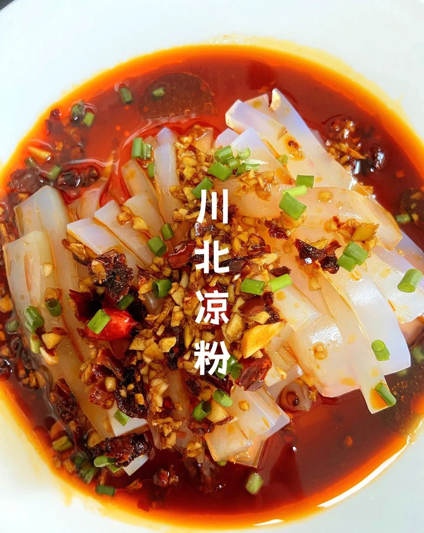 - **特点**:川北凉粉是南充的传统小吃,以豌豆或绿豆为原料制成,口感爽滑,搭配麻辣调料,酸辣开胃。