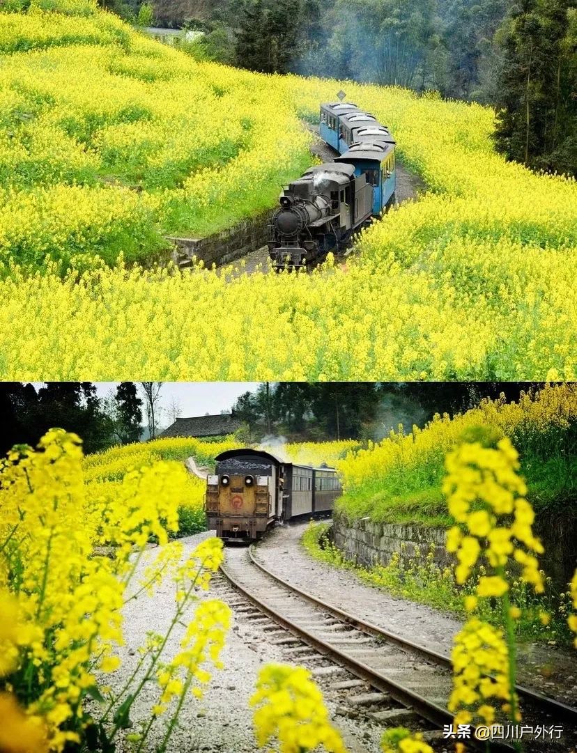 嘉阳小火车距离成都2.5小时,每年三2月到3月,这里遍地的油菜花,小火车穿行在金色花海里,清风拂过的菜籽花香,比千与千寻的小火车还要美妙。还有废弃的蒸汽火车,作为摄影取景是非常不错的,这里,已经成为每年春天必去的地点之一。因为油菜花配蒸汽小火车,这种豪华配置的景色在全球仅此一处,别无二家。
